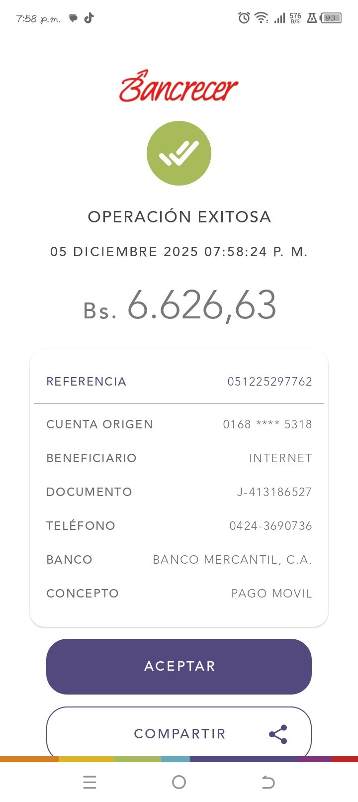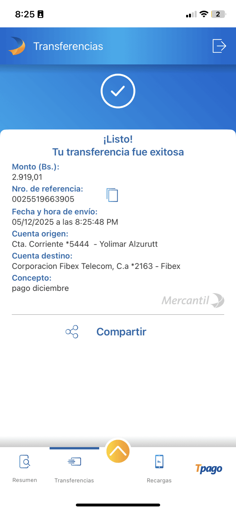 | A2911 | MIGUELANGEL BENITEZ SANOJA | 2025-12-05 | MERCANTIL-4381-ARAGU | 317051 | | 38.23 BS | 247.30 | REGISTRADO |