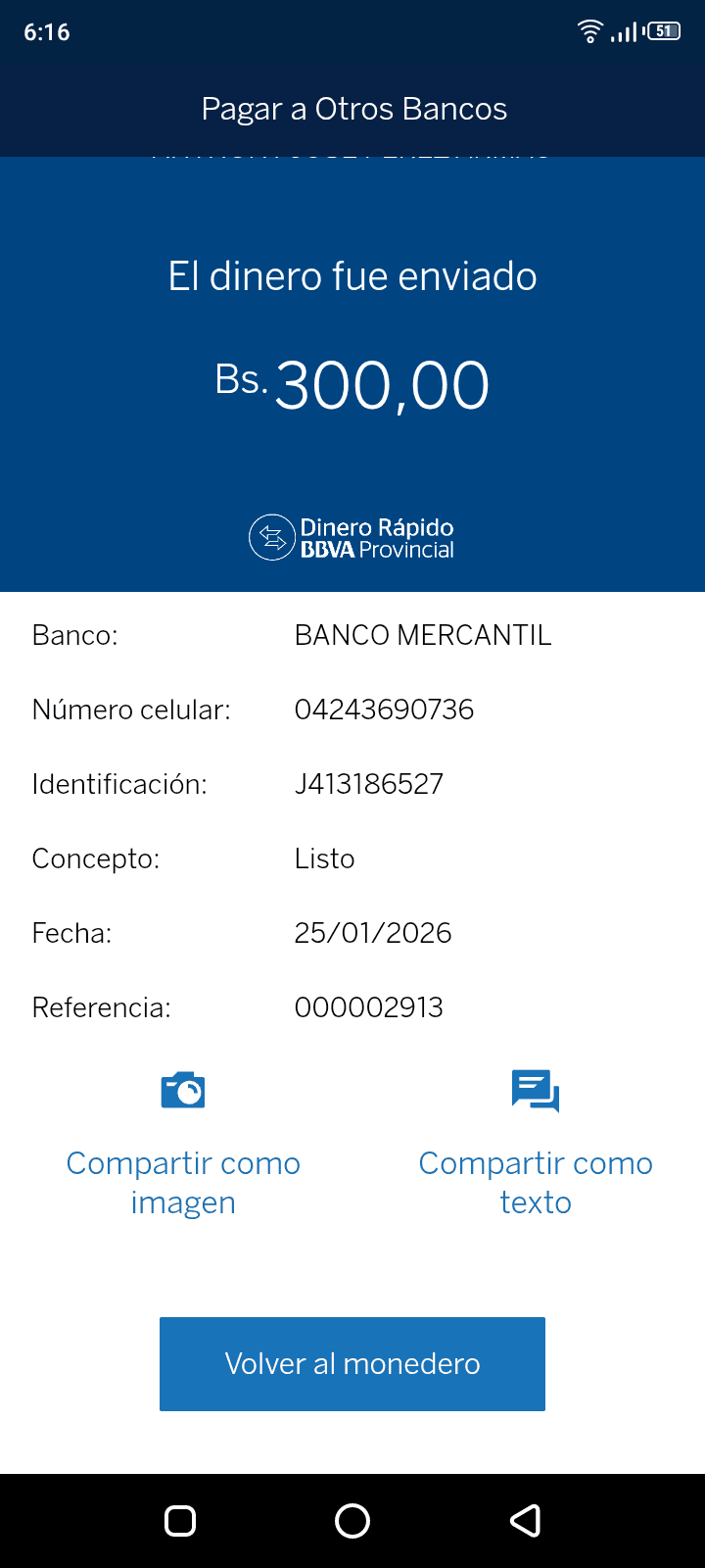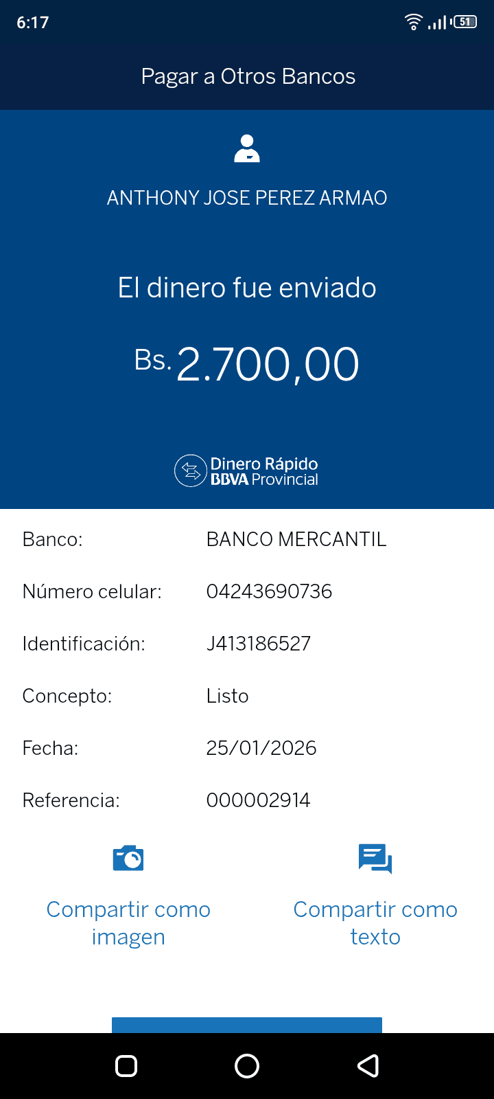 | A51276 | JENIFET CAROLINA GRATEROL AGUIRRE | 2026-01-25 | MERCANTIL-4381-ARAGU | 51240134 | | 10,000.00 BS | 301.37 | REGISTRADO |