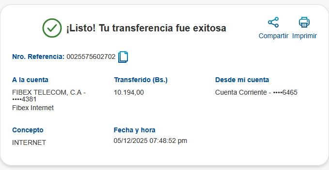 | GU18437 | ANA ZORAYA CAMERO | 2025-12-05 | MERCANTIL 2163 | 97351485 | | 8,410.73 BS | 247.30 | REGISTRADO |