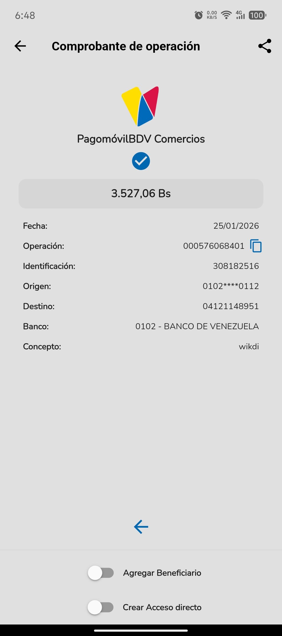 | A16040 | KATTY MARIANELLA PINTO ESQUEDA | 2026-01-25 | MERCANTIL-4381-ARAGU | 76068401 | | 3,527.06 BS | 301.37 | REGISTRADO |