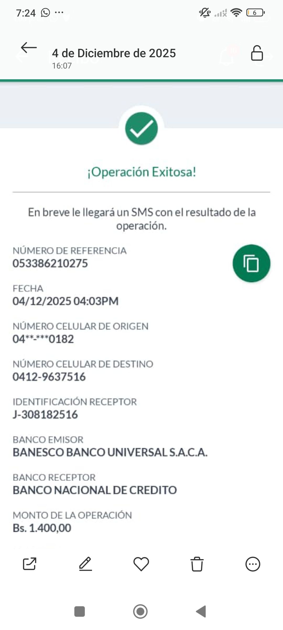 | V40843 | ENEIDA COROMOTO PETIT LAGUNA | 2025-12-05 | MERCANTIL 2163 | 53390649855 | | 7,400.00 BS | 247.30 | REGISTRADO |