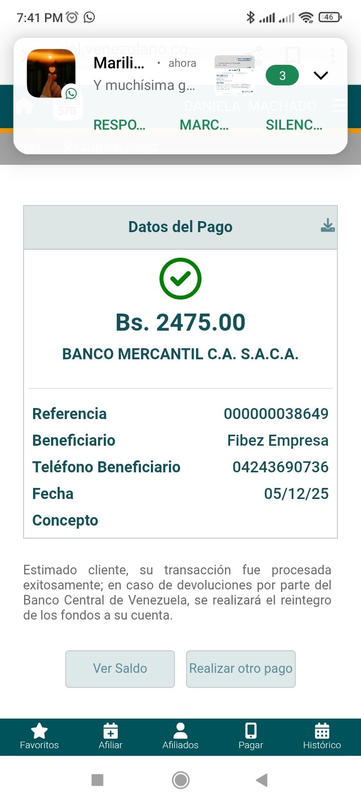 | A46551 | MARILIN DEL VALLE SILVA CONDE | 2025-12-05 | MERCANTIL-4381-ARAGU | 3864900 | | 2,475.00 BS | 247.30 | REGISTRADO |