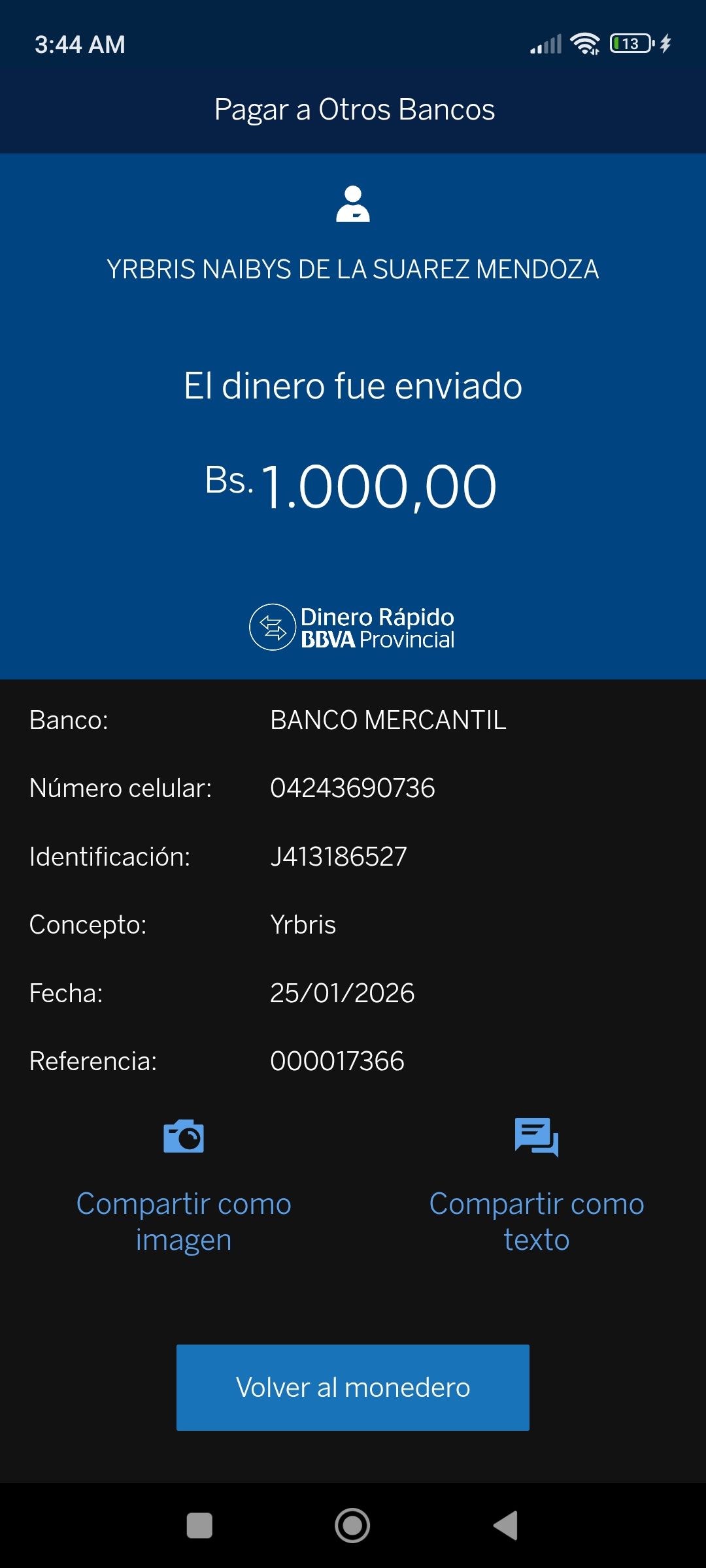 | A17085 | DIANA MARIBEL MEJIAS GONZALEZ | 2026-01-25 | MERCANTIL-4381-ARAGU | 02742688 | | 10,581.19 BS | 301.37 | REGISTRADO |