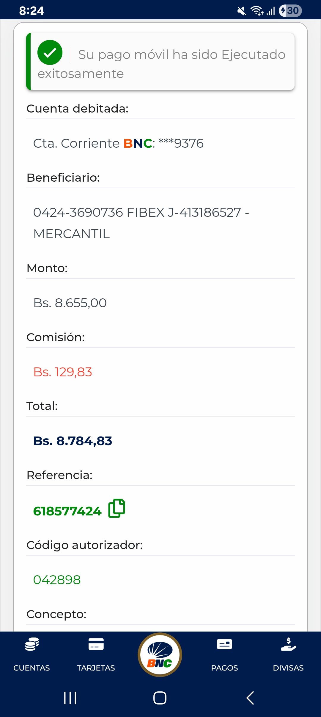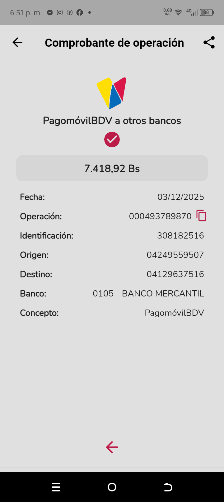 | BQ26618 | GREIMAR STEFANY ANGEL HERNáNDEZ | 2025-12-05 | MERCANTIL 2163 | 90613074 | | 3,709.50 BS | 247.30 | REGISTRADO |