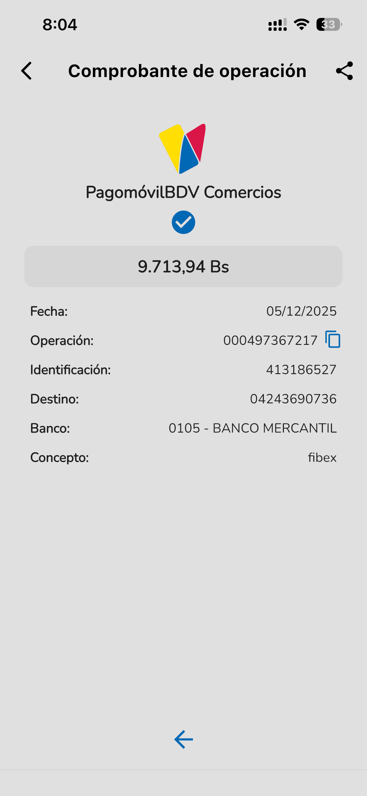 | A33298 | NELIDA EVELYN BLANCO FLORES | 2025-12-05 | MERCANTIL-4381-ARAGU | 99061125 | | 25.49 BS | 247.30 | REGISTRADO |