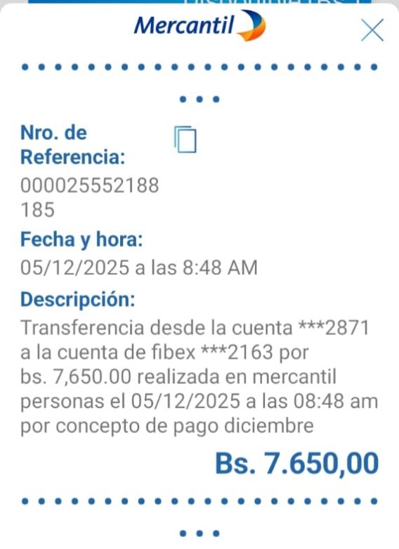 | A62303 | KLEYSY ALEXANDRA FUNTES ALVAREZ | 2025-12-05 | MERCANTIL-4381-ARAGU | 334797 | | 7,419.00 BS | 247.30 | REGISTRADO |