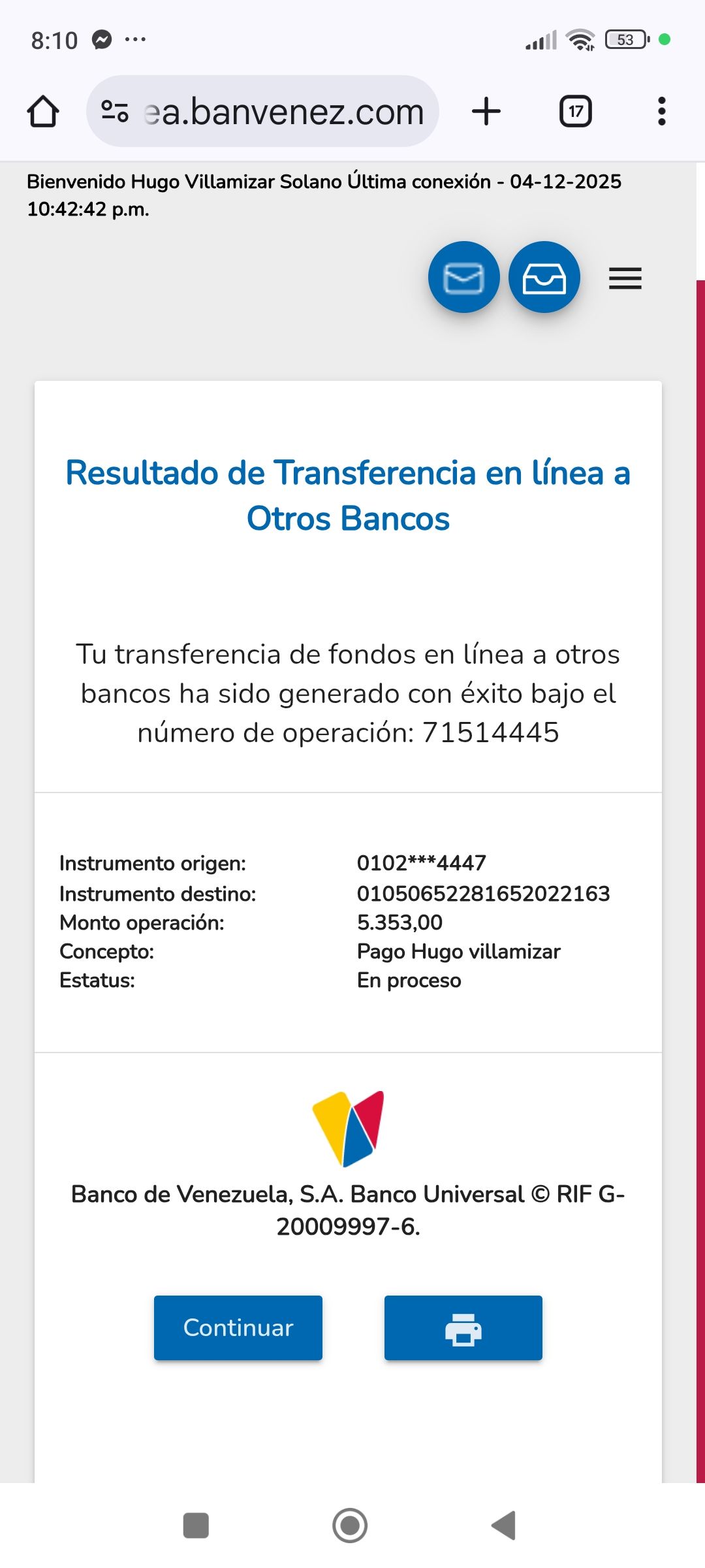 | V0669 | HUGO VILLAMIZAR SOLANO | 2025-12-05 | MERCANTIL 2163 | 71514445 | | 5,353.00 BS | 247.30 | REGISTRADO |