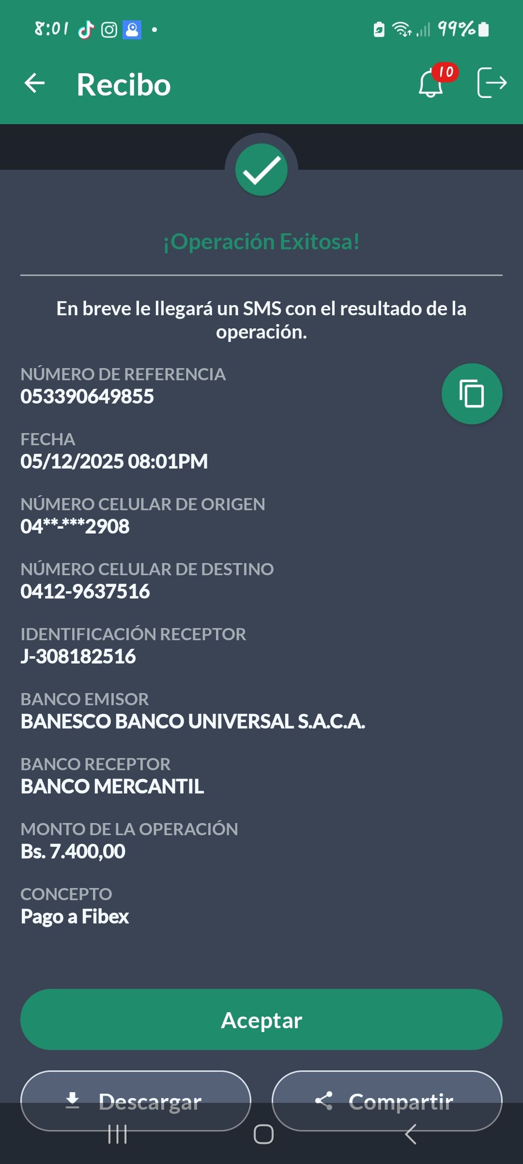 | C10137 | YUSMARY CAROLINA CABEZAS SANTOS | 2025-12-05 | MERCANTIL 2163 | 203500000 | | 10,320.00 BS | 247.30 | REGISTRADO |