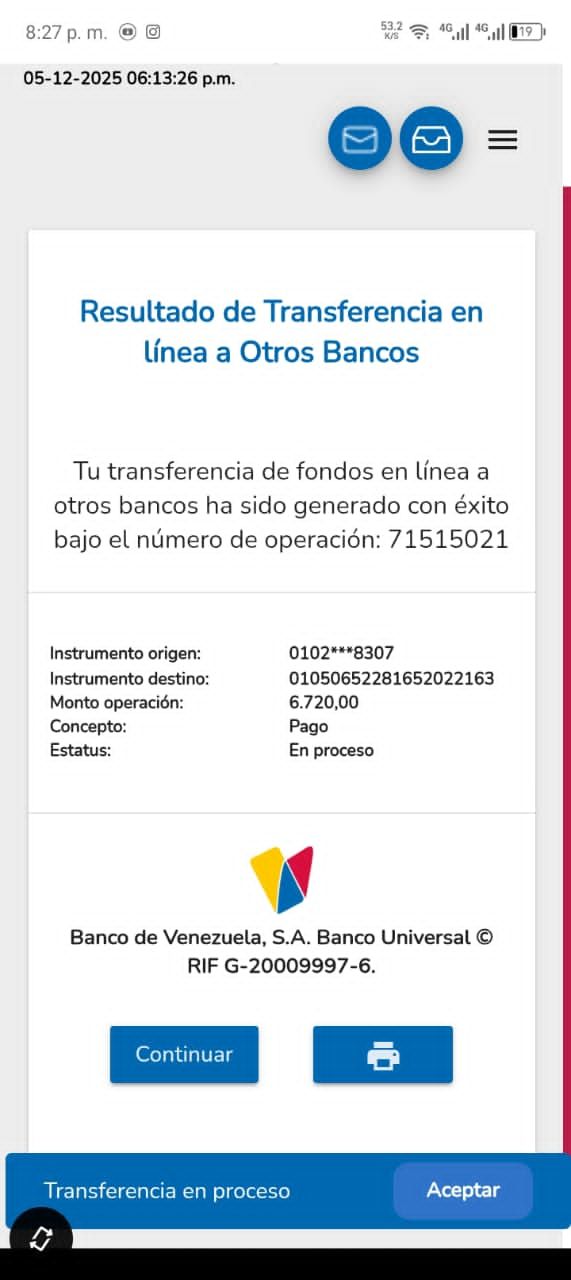 | V45507 | MRIRIAN RAFAELA ARANGURE FLORES | 2025-12-05 | MERCANTIL 2163 | 71515021 | | 6,720.00 BS | 247.30 | REGISTRADO |