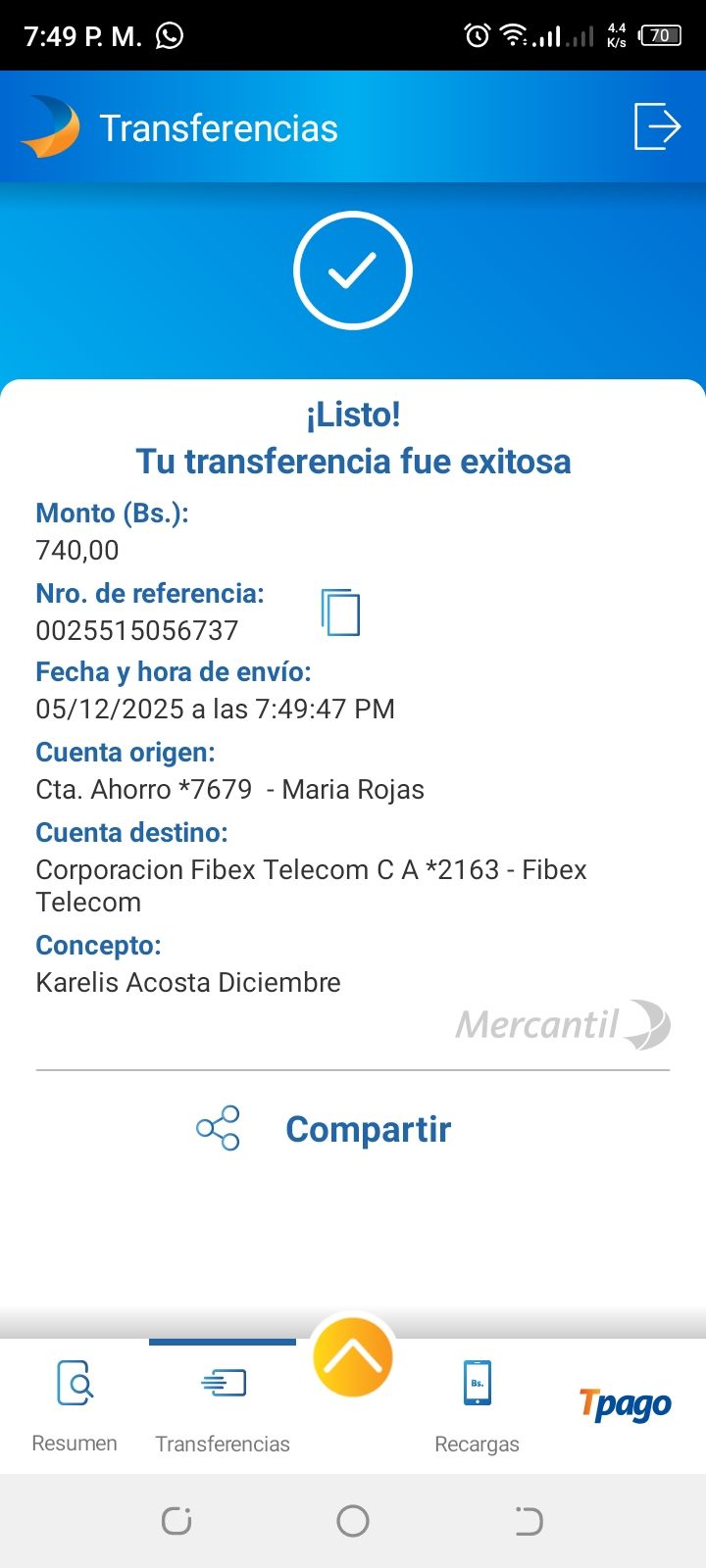 | V72682 | KARELYS DAYANA ACOSTA RIVAS | 2025-12-05 | MERCANTIL 2163 | 15056737 | | 740.00 BS | 247.30 | REGISTRADO |