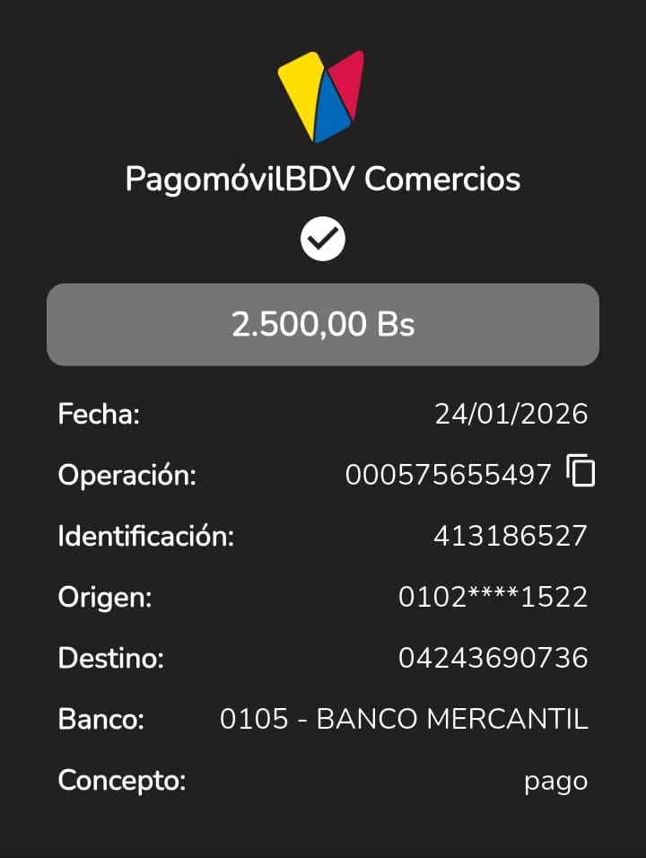 | A58841 | DARWINS JOSE RAMOS RUIZ | 2026-01-25 | MERCANTIL 2163 | 661313275 | | 8,000.00 BS | 301.37 | REGISTRADO |