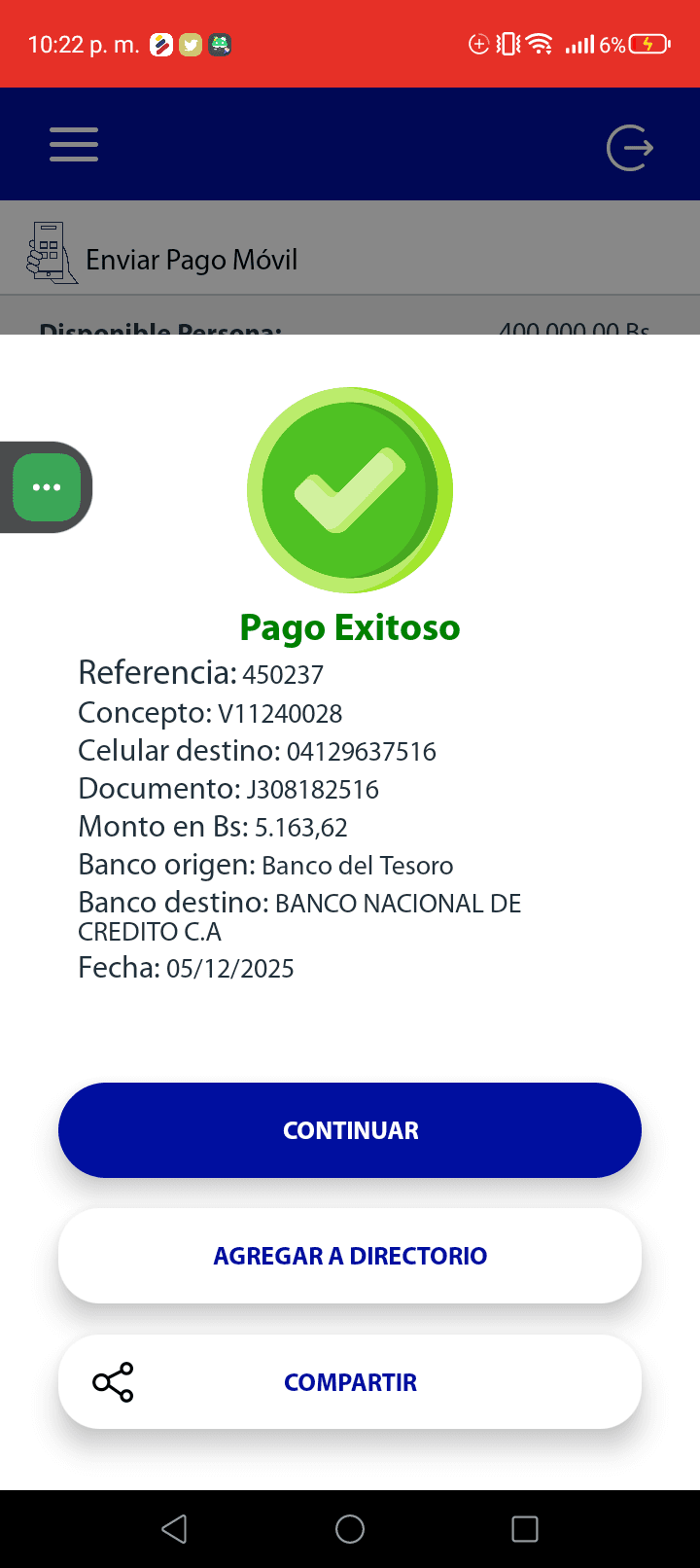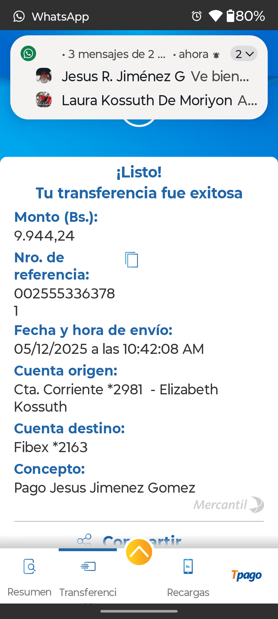| LCH30913 | JESUS RAFAEL JIMENEZ GOMEZ | 2025-12-05 | MERCANTIL 2163 | 55336378 | | 9,944.24 BS | 247.30 | REGISTRADO |