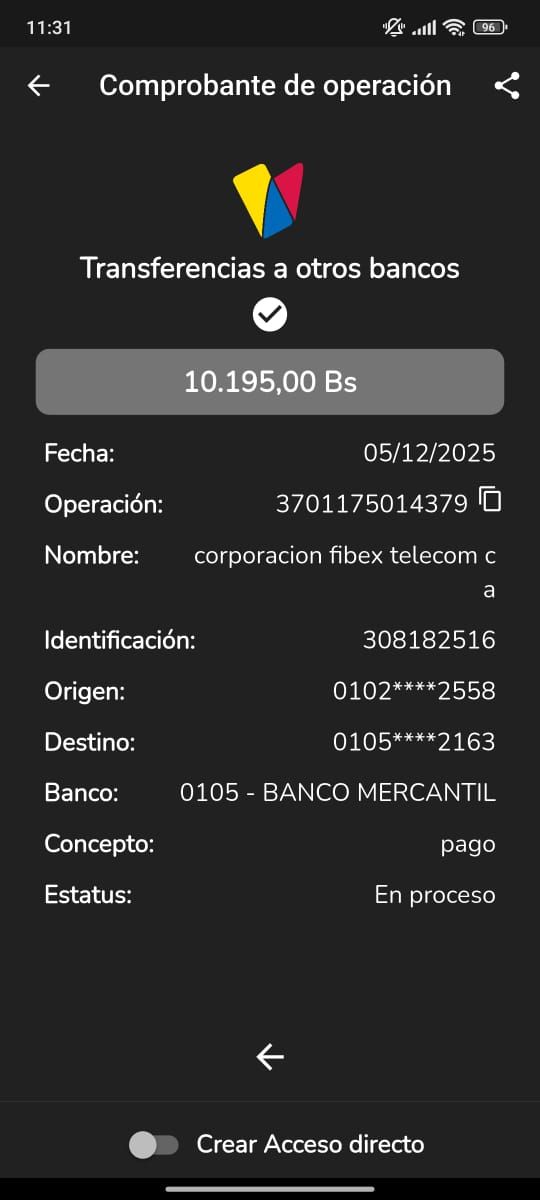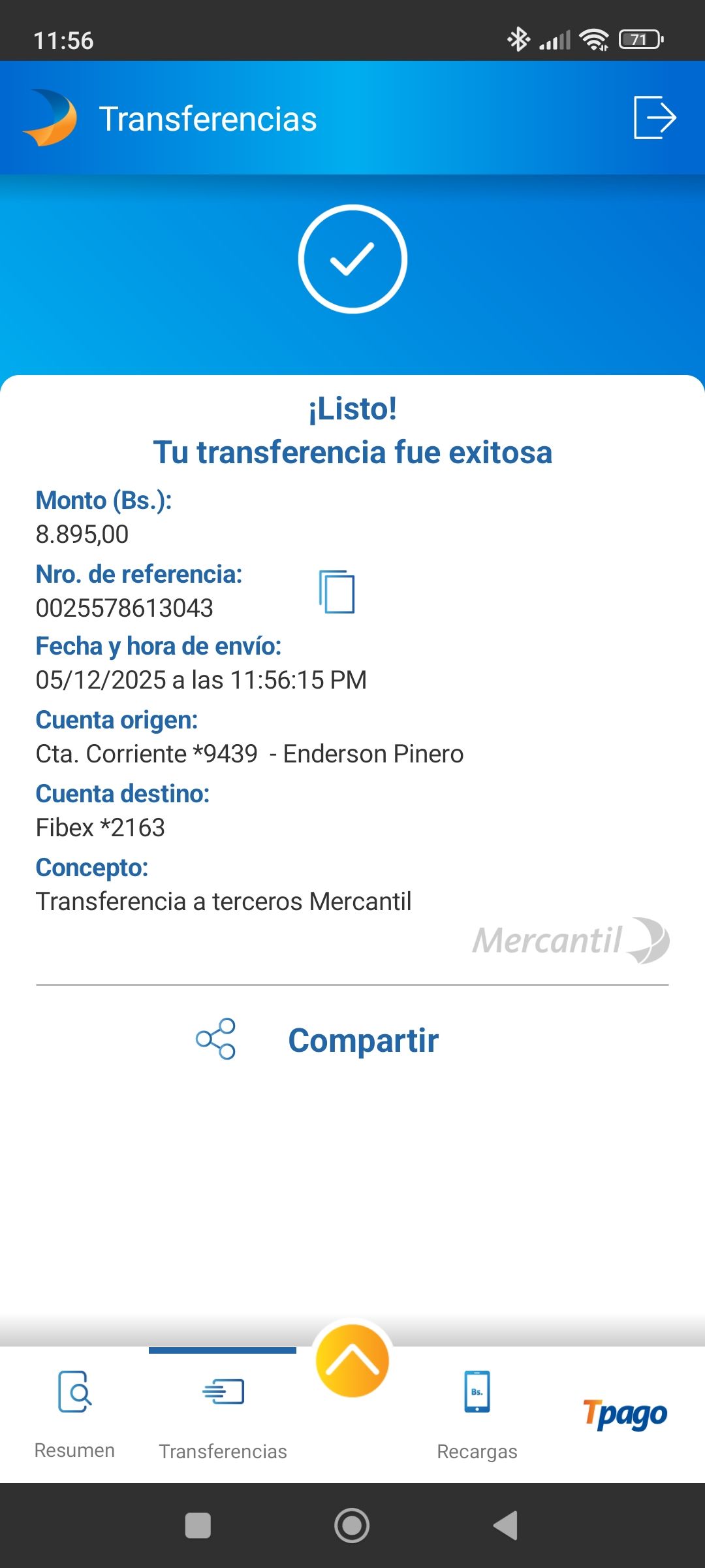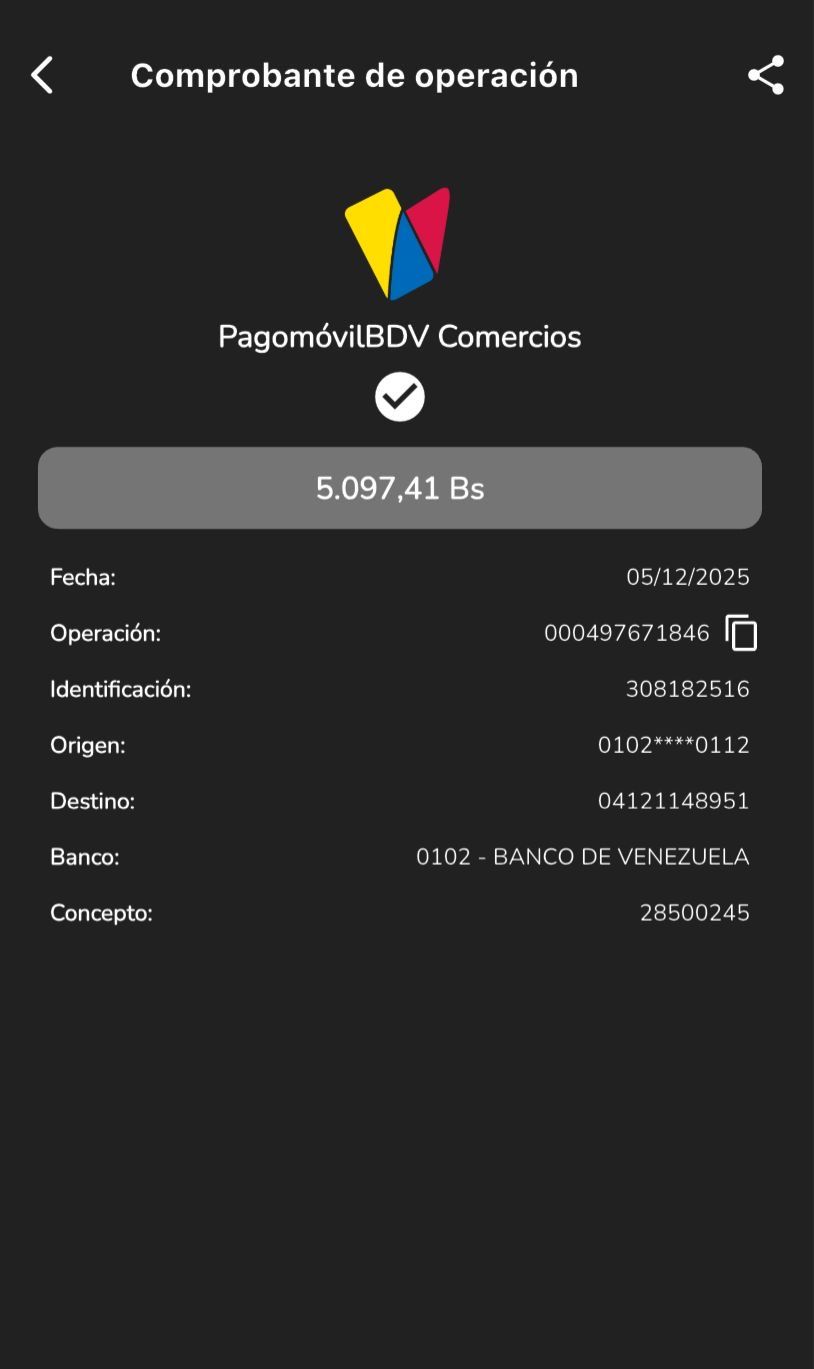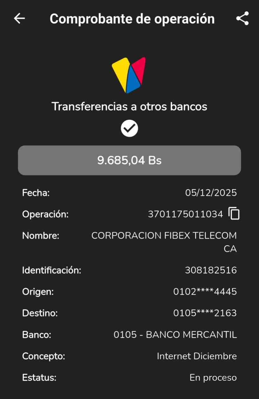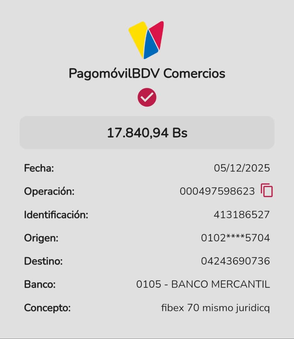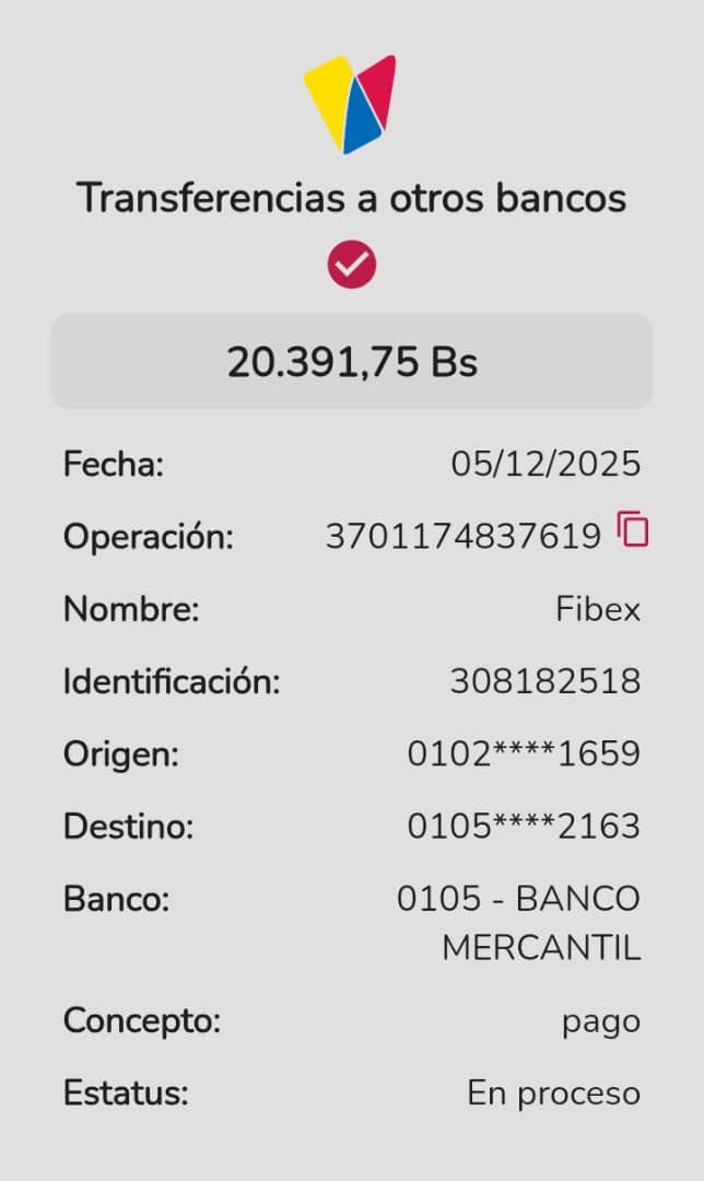 | LCH70465 | LUCIMAR DEL COROMOTO FAJARDO FIGUEROA | 2025-12-05 | MERCANTIL 2163 | 91040148 | | 500.00 BS | 247.30 | REGISTRADO |