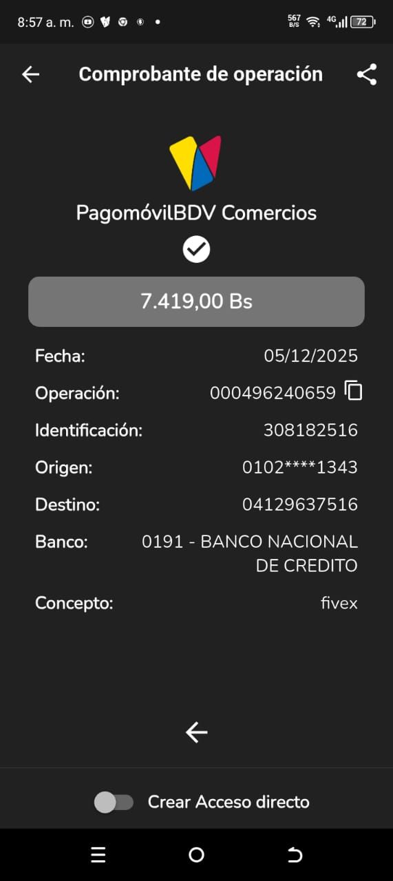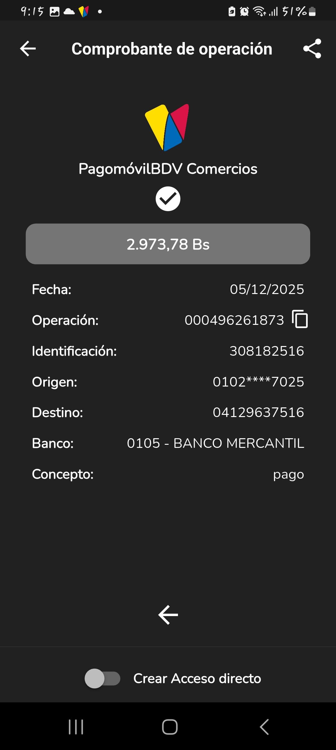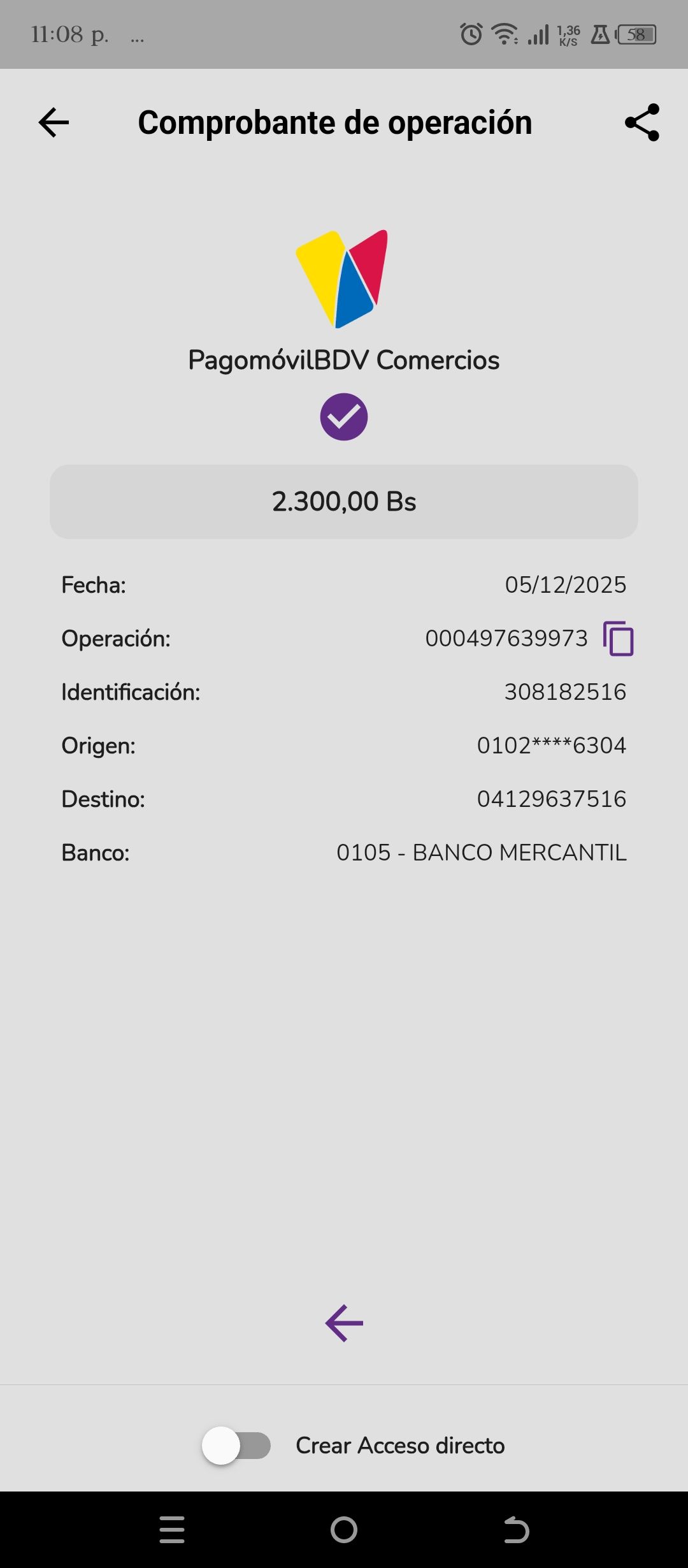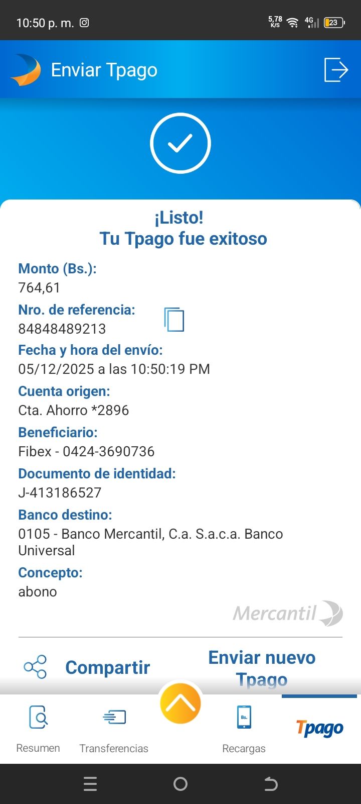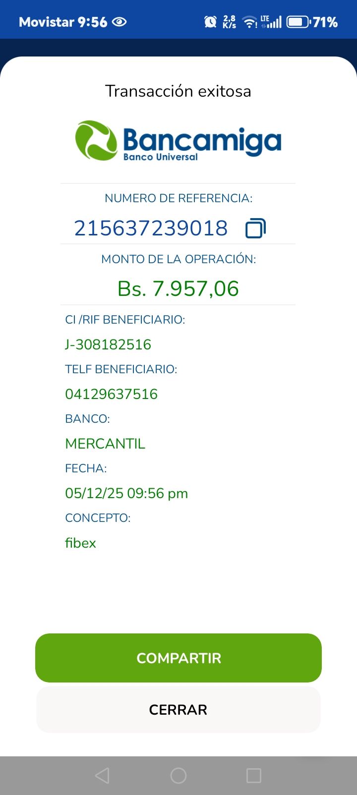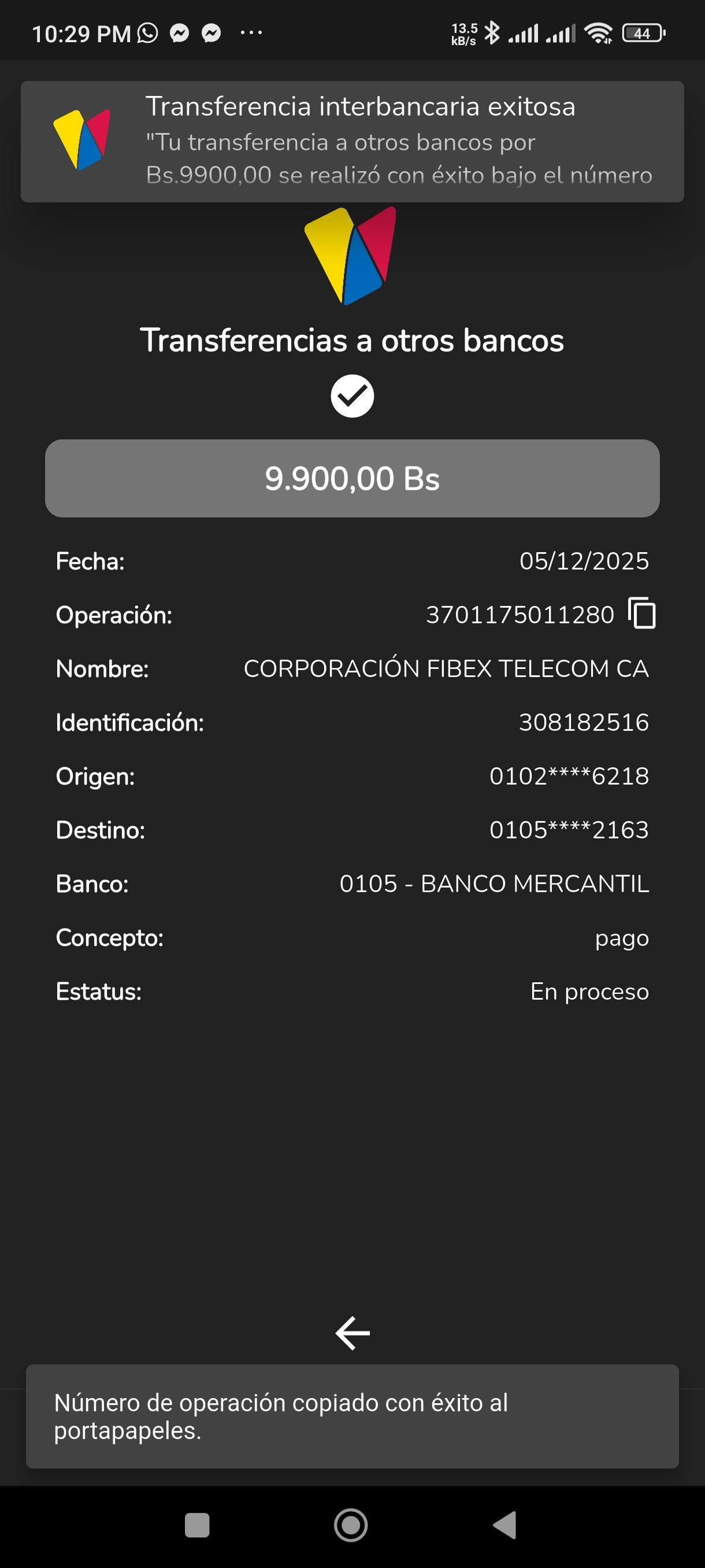 | LCH70465 | LUCIMAR DEL COROMOTO FAJARDO FIGUEROA | 2025-12-05 | MERCANTIL 2163 | 91040148 | | 500.00 BS | 247.30 | REGISTRADO |