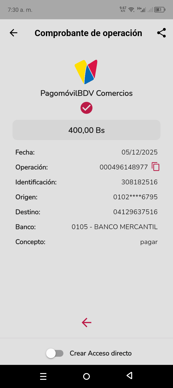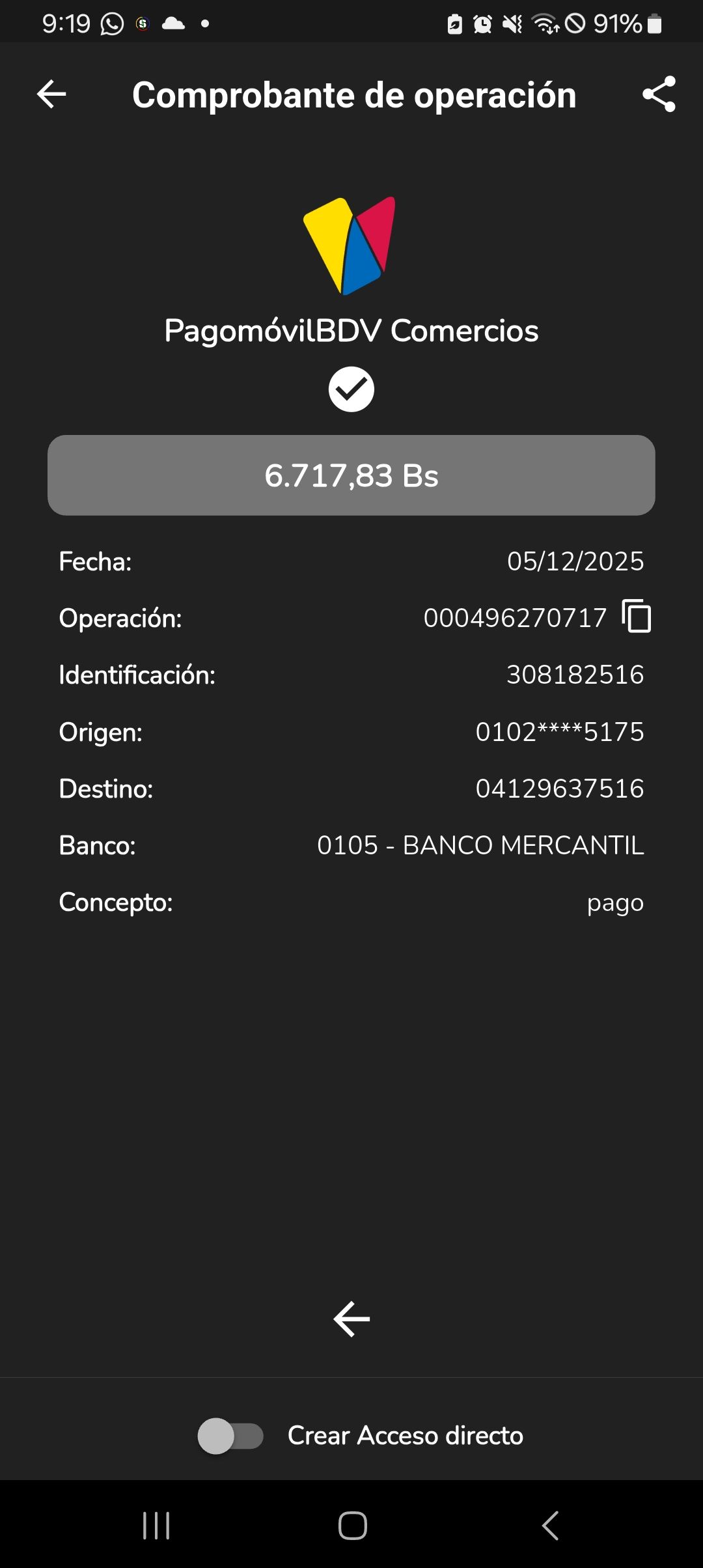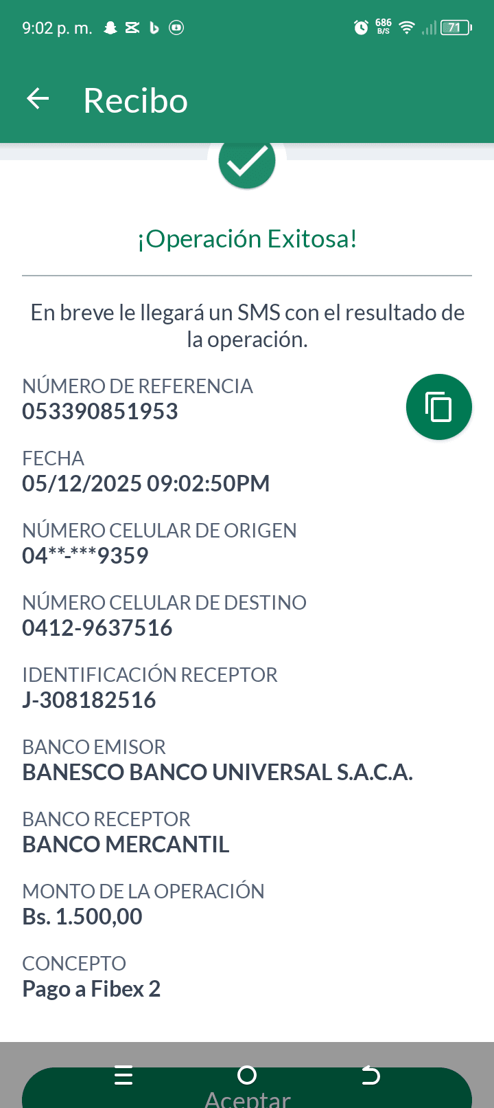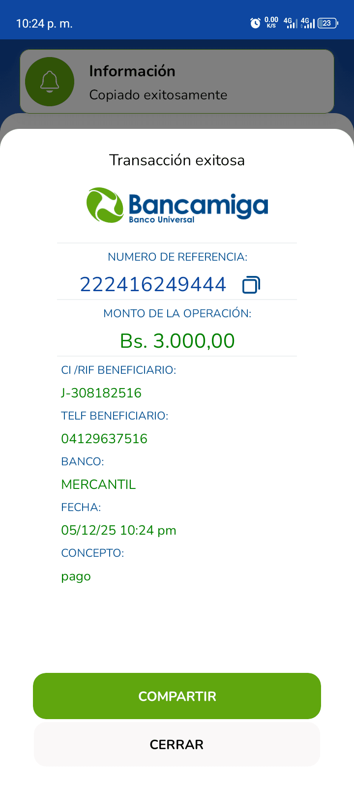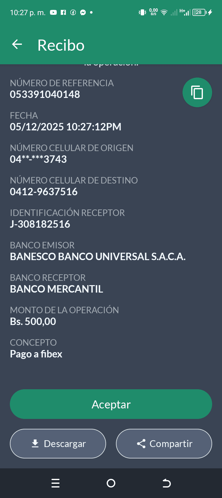 | LCH70465 | LUCIMAR DEL COROMOTO FAJARDO FIGUEROA | 2025-12-05 | MERCANTIL 2163 | 91040148 | | 500.00 BS | 247.30 | REGISTRADO |