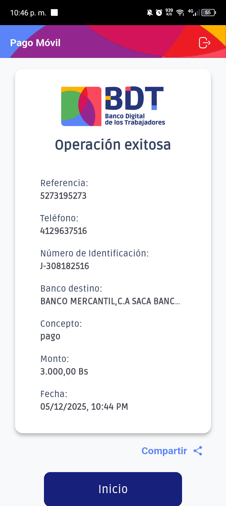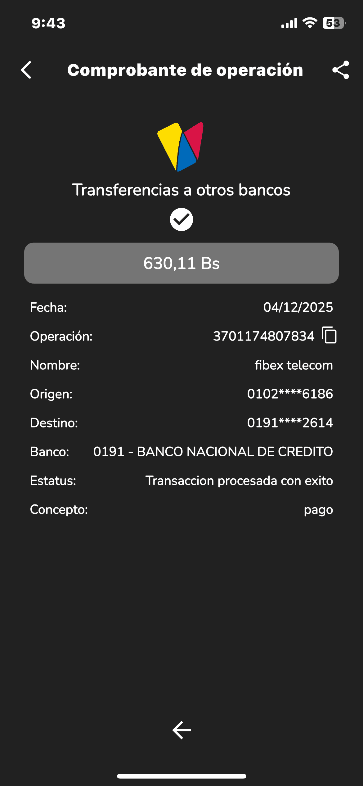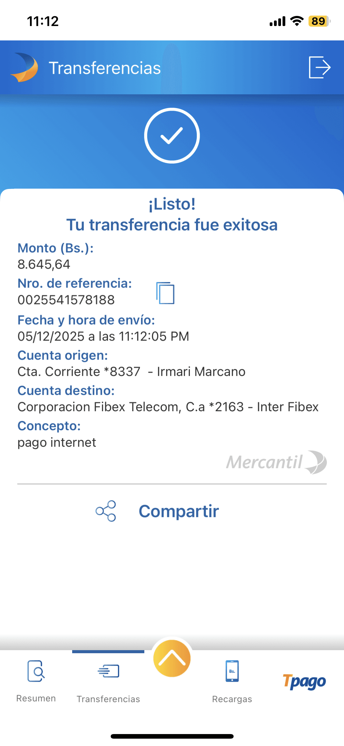 | A63062 | YOSMARI YUMISBEL ARCILA NIETO | 2025-12-05 | MERCANTIL-4381-ARAGU | 95562239 | | 4,946.00 BS | 247.30 | REGISTRADO |