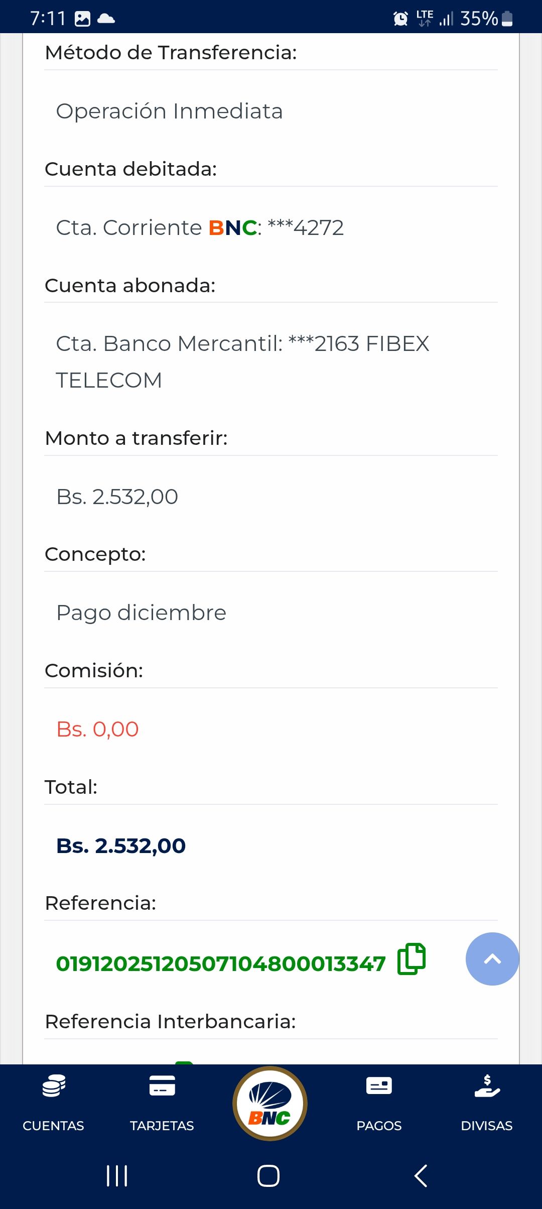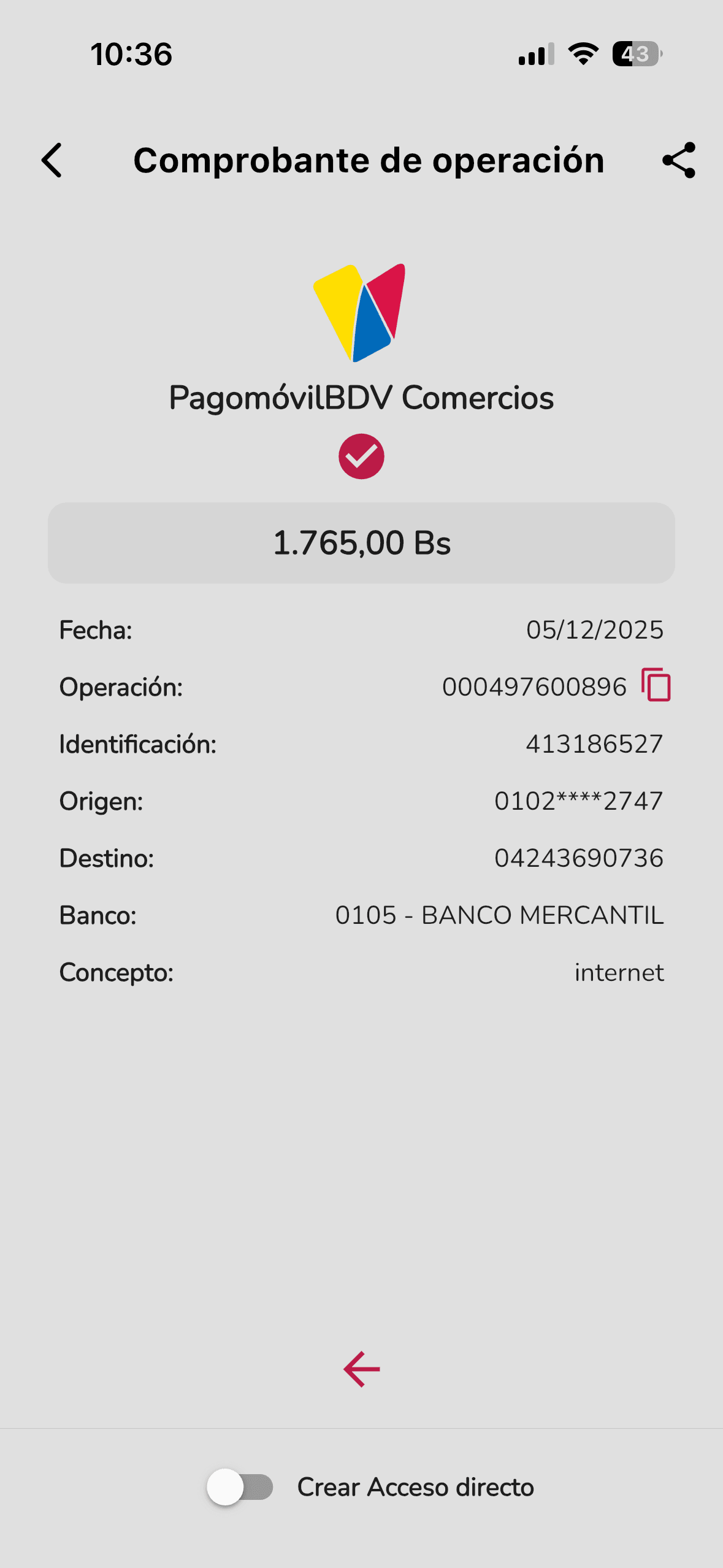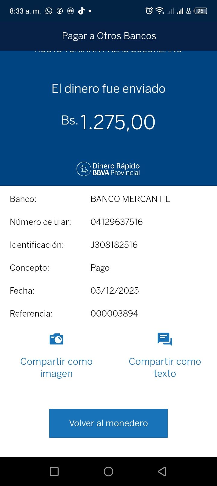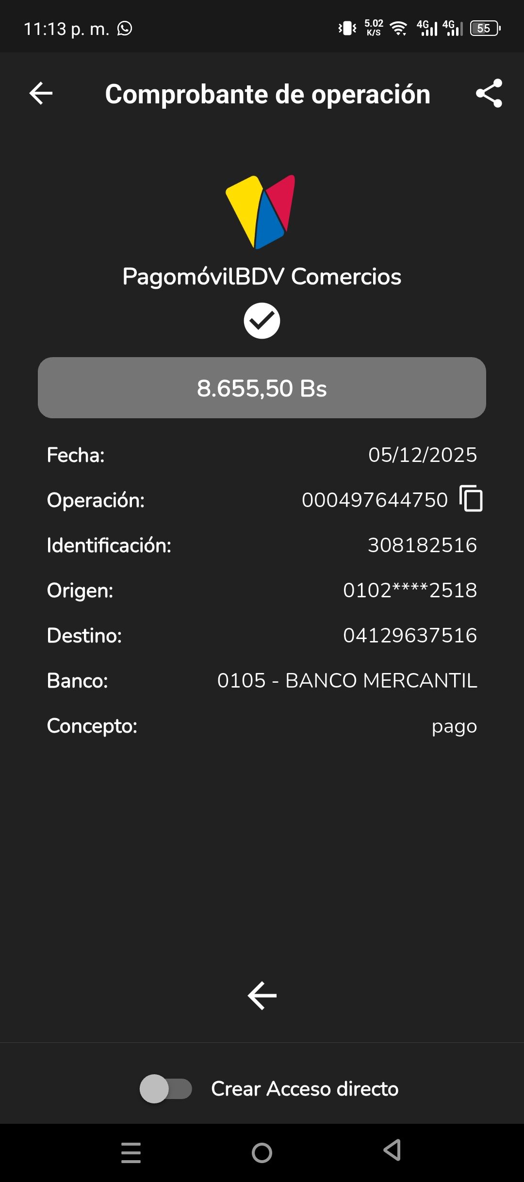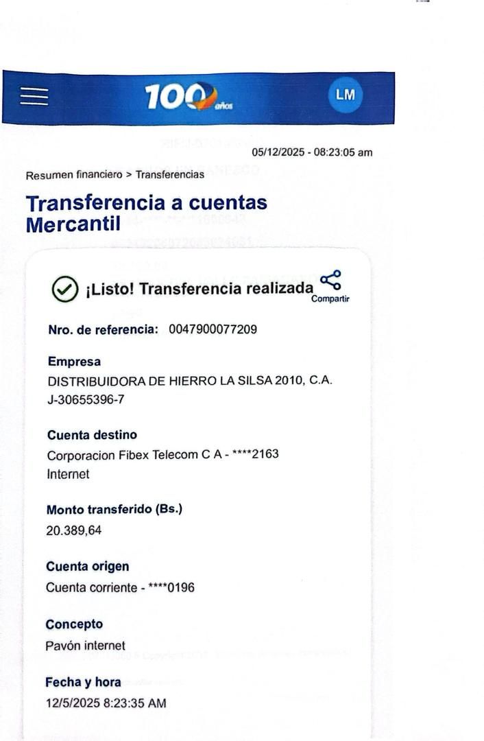 | LCH52702 | JOSÉ GREGORIO JIMÉNEZ GÓMEZ | 2025-12-05 | MERCANTIL 2163 | 000497644750 | | 8,655.50 BS | 247.30 | REGISTRADO |