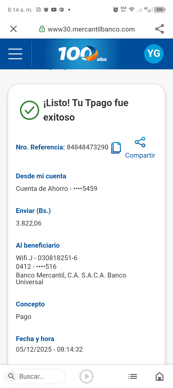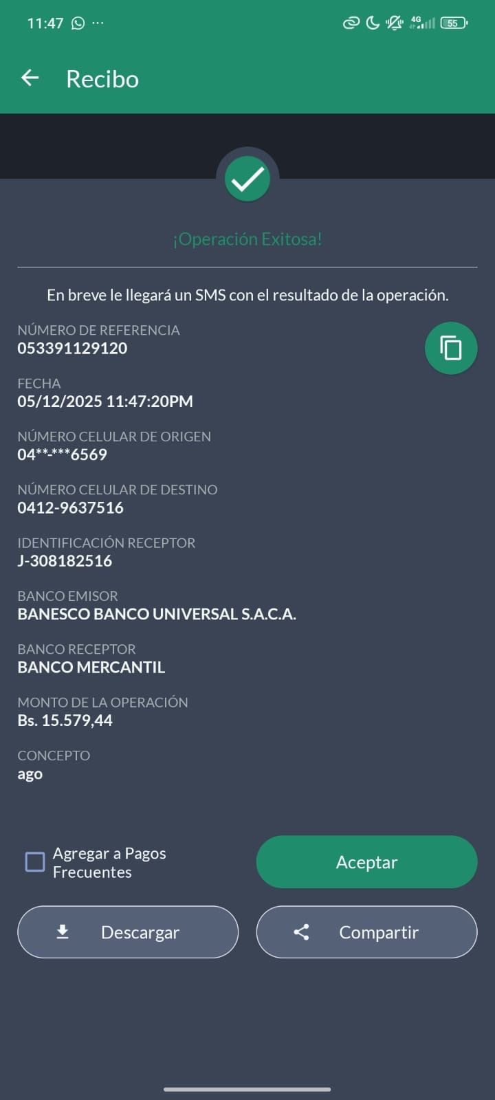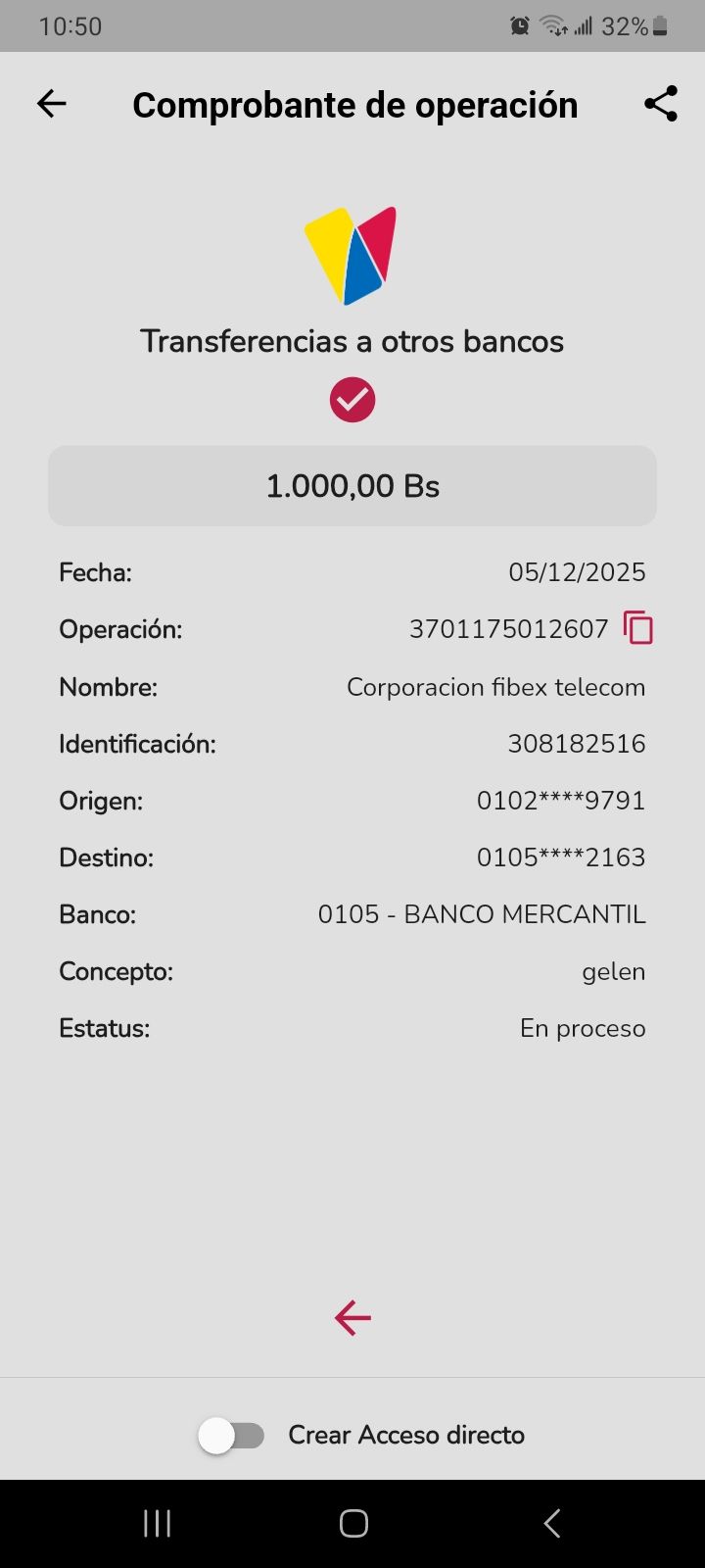| MGTA4279 | MARISOL GONZALEZ DE RODRIGUEZ | 2025-12-05 | MERCANTIL 2163 | 91129120 | | 15,579.44 BS | 247.30 | REGISTRADO |