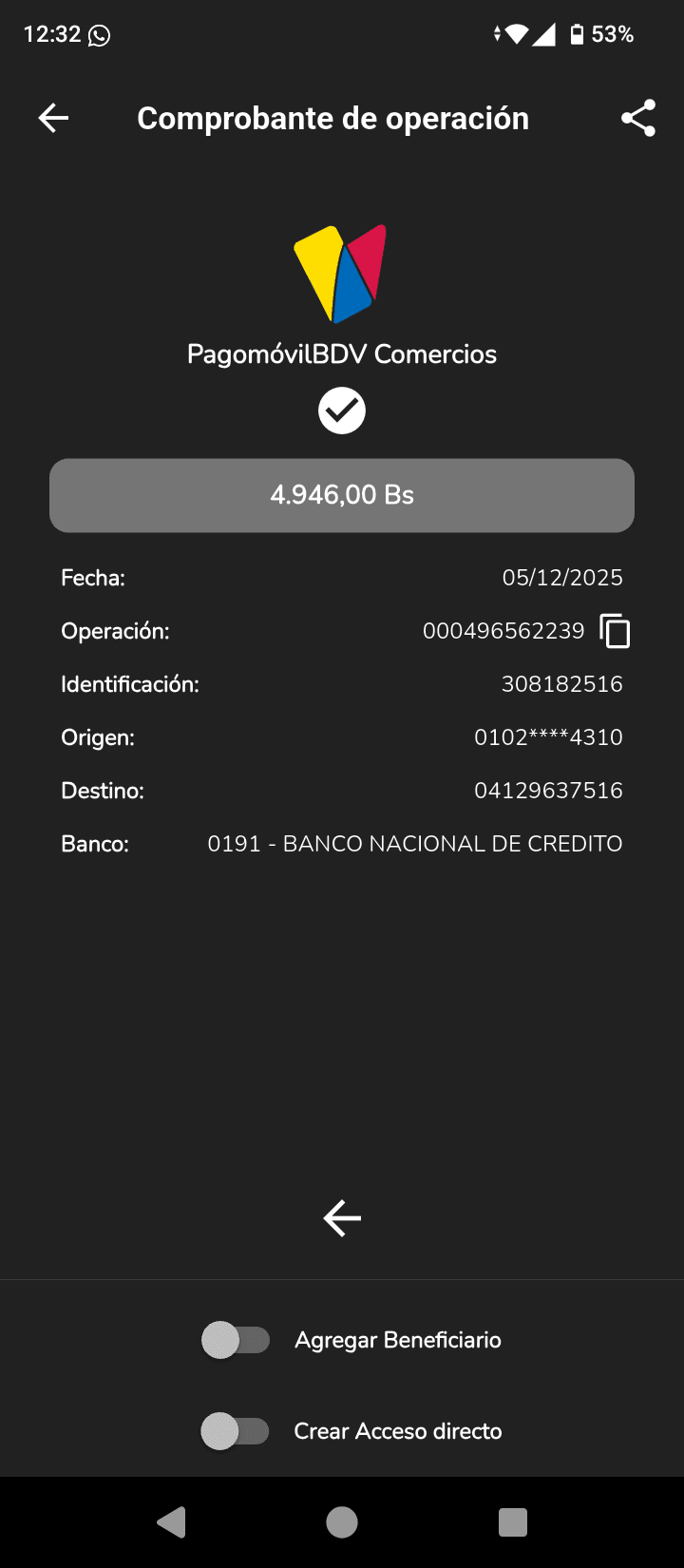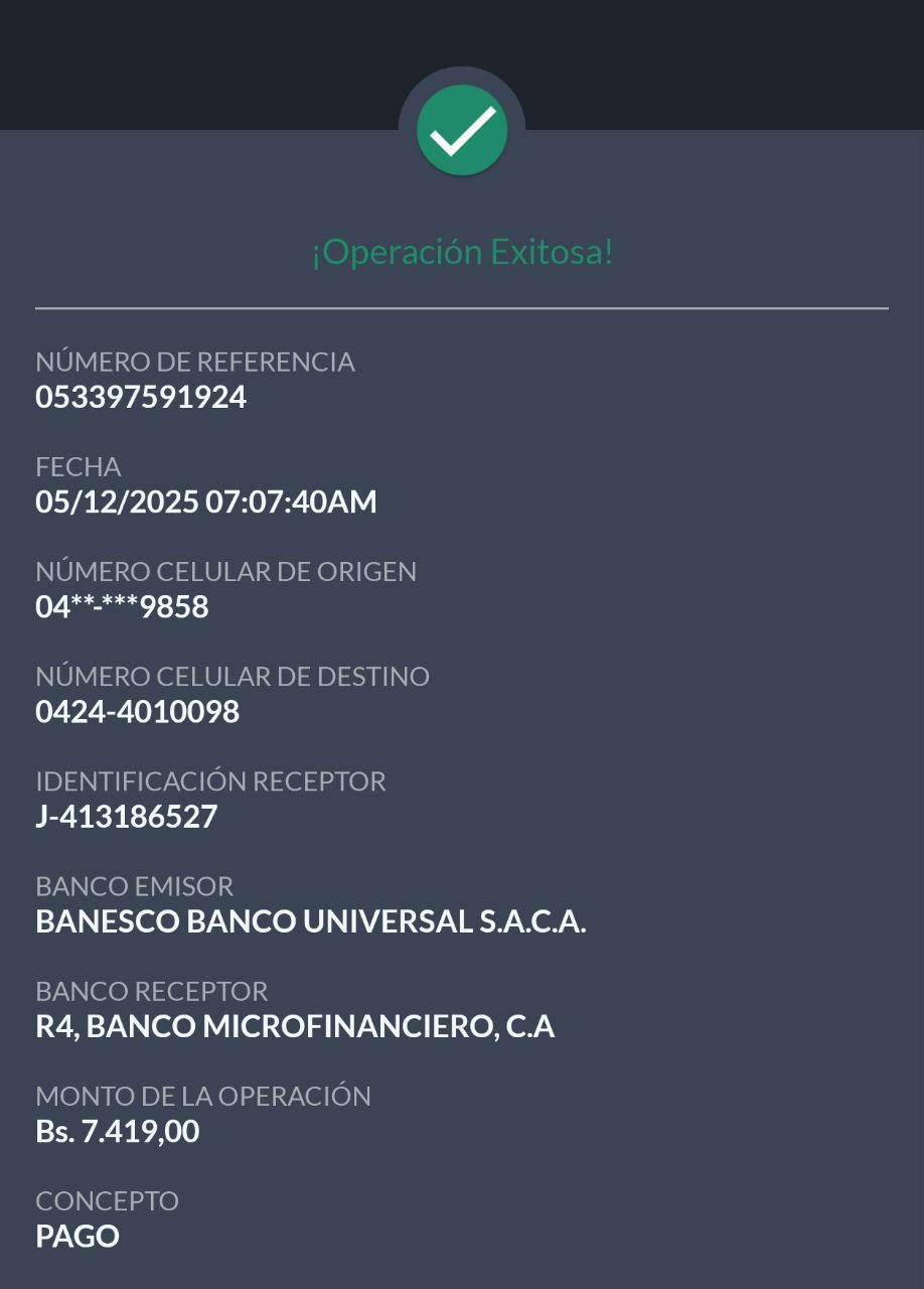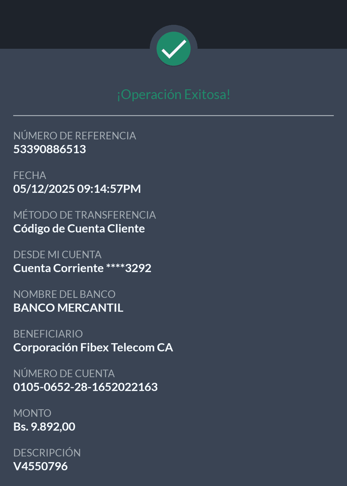 | LCH1094 | SOAGUN RAFAEL ARMAS DEL ROSARIO | 2025-12-05 | MERCANTIL 2163 | 90886513 | | 9,892.00 BS | 247.30 | REGISTRADO |