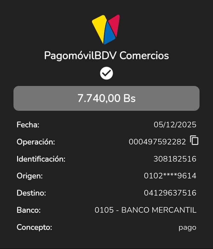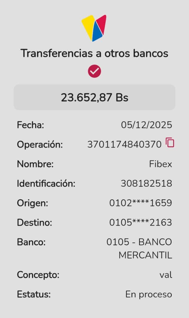 | VC2096 | YURANYS DE LOS ANGELES GARBAN VILLARROEL | 2025-12-05 | MERCANTIL 2163 | 48473292 | | 3,822.06 BS | 247.30 | REGISTRADO |