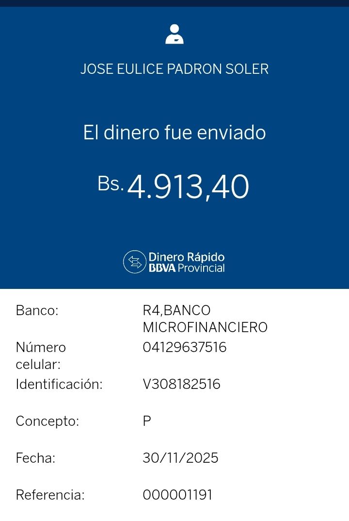 | GU4682 | JOSE EULICE PADRON SOLER | 2025-11-30 | BNC 2614 | 00001191 | | 4,913.40 BS | 223.96 | REGISTRADO |