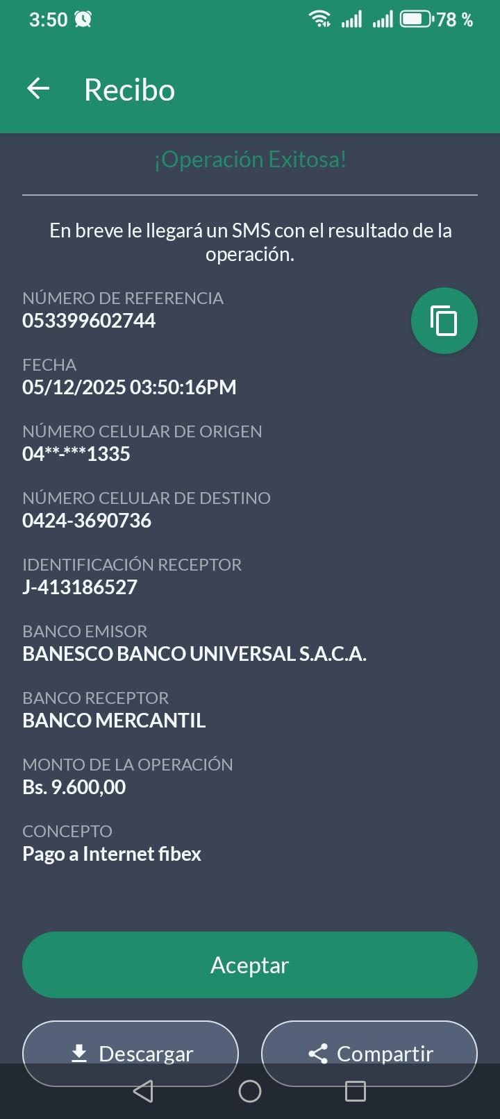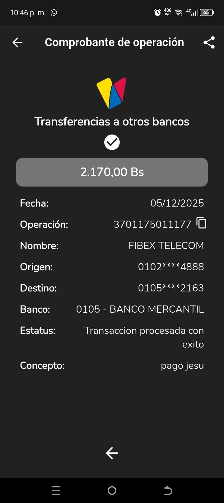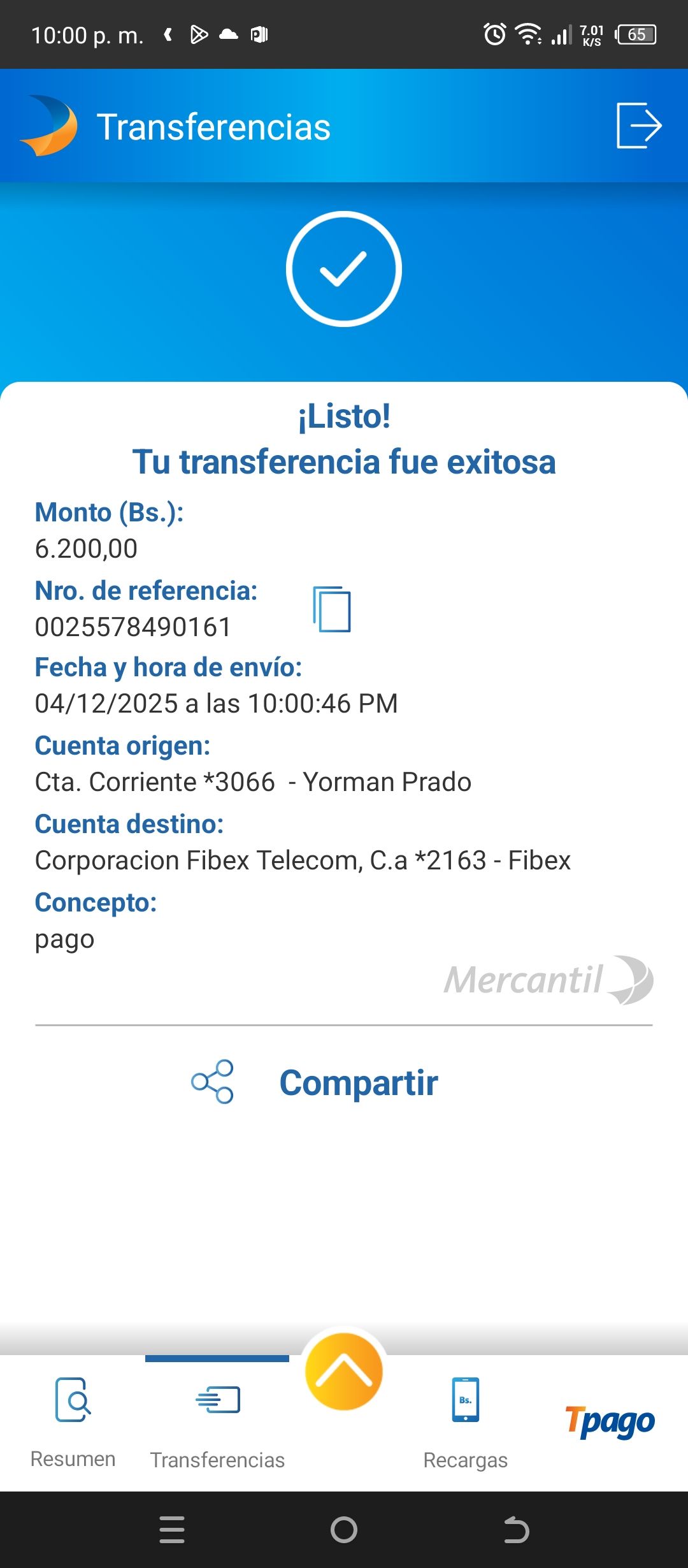 | T3694 | FRAN DAVID MANSABE QUINTANA | 2025-11-15 | MERCANTIL 2163 | 65579058 | | 2,718.87 BS | 223.96 | REGISTRADO |