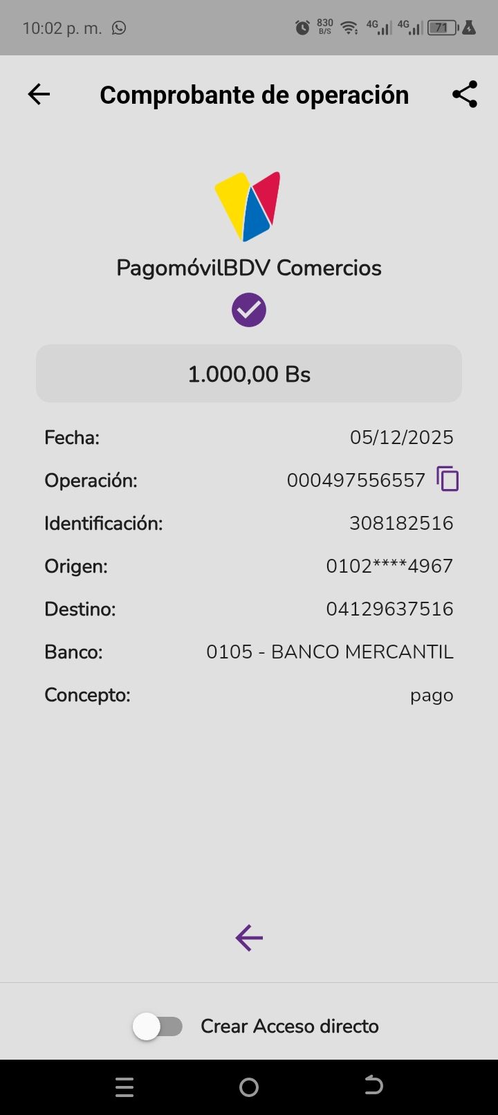 | V111617 | EDISON ALFONZO ACOSTA ALVARADO | 2025-12-05 | MERCANTIL 2163 | 97556557 | | 1,000.00 BS | 247.30 | REGISTRADO |