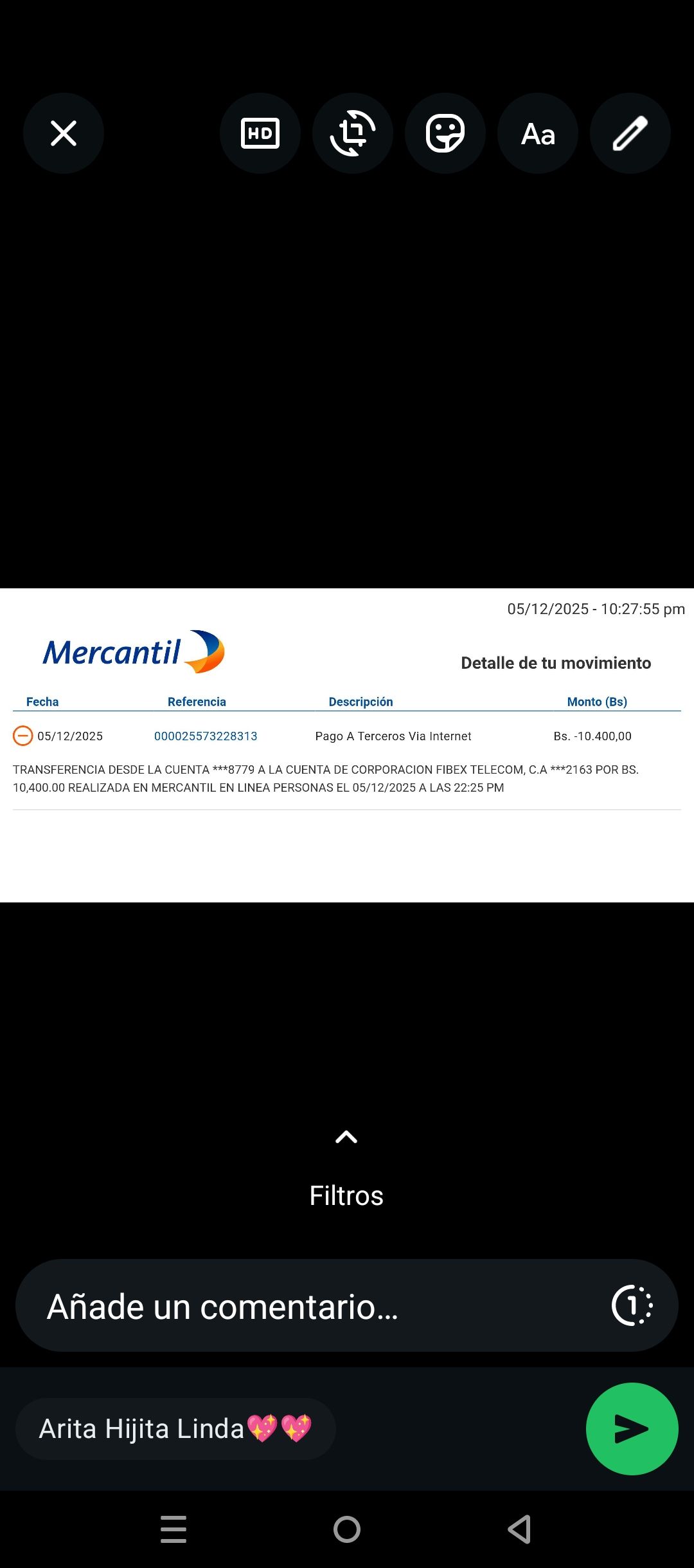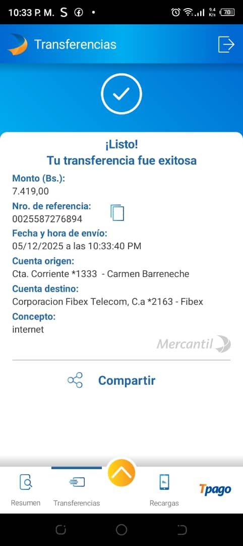 | V53747 | CARMEN MARIA BARRENECHEA CASTILLO | 2025-12-05 | MERCANTIL 2163 | 87276894 | | 7,419.00 BS | 247.30 | REGISTRADO |