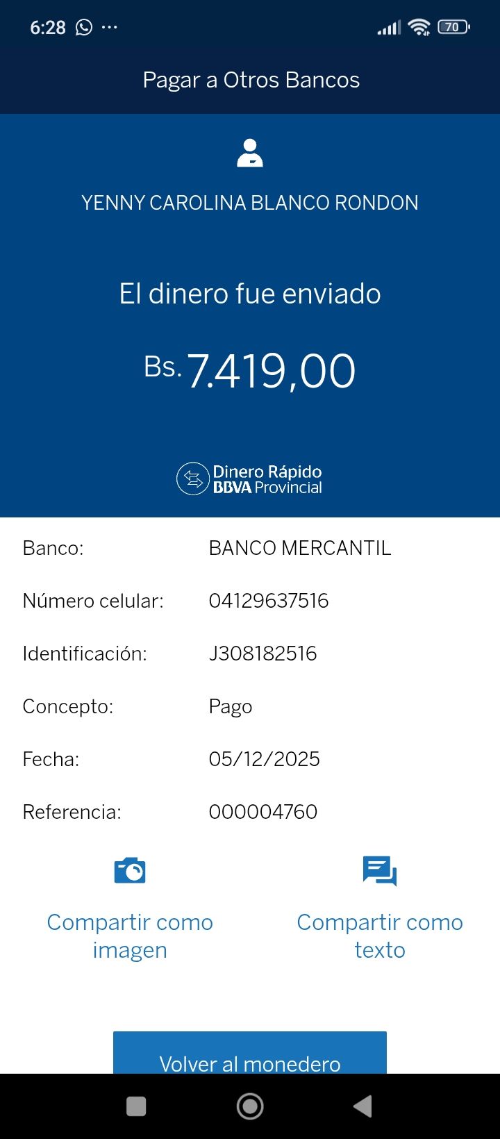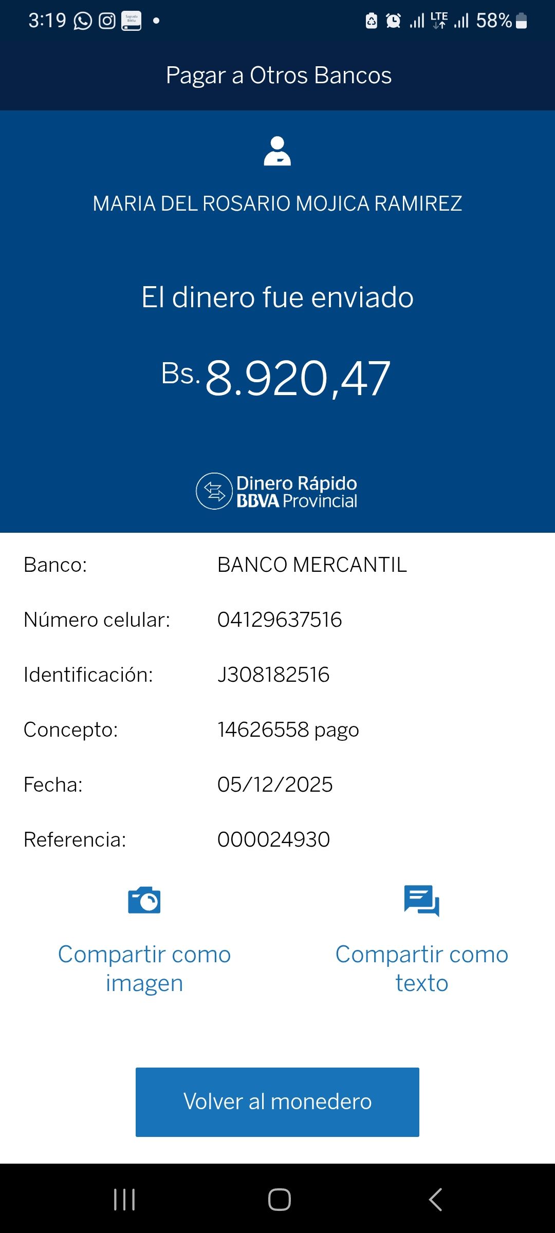 | LCH77081 | MARIA DEL ROSARIO MOJICA RAMIREZ | 2025-12-05 | MERCANTIL 2163 | 00002454 | | 8,920.47 BS | 247.30 | REGISTRADO |