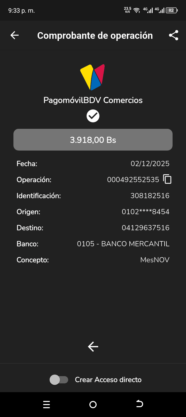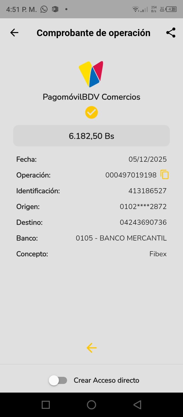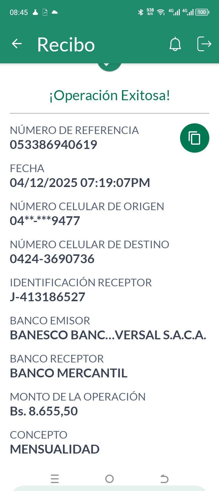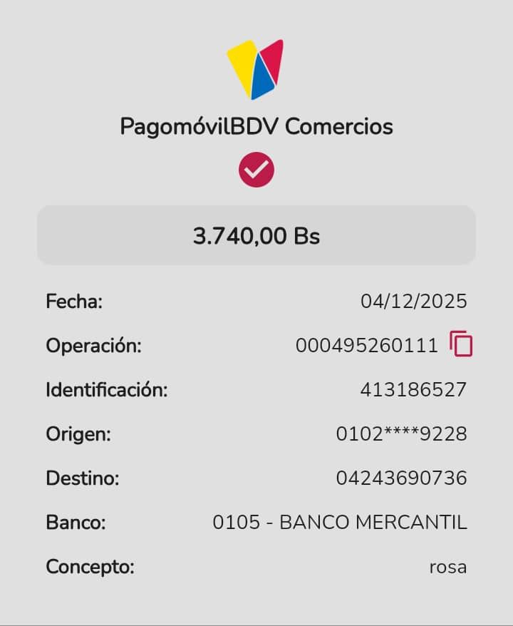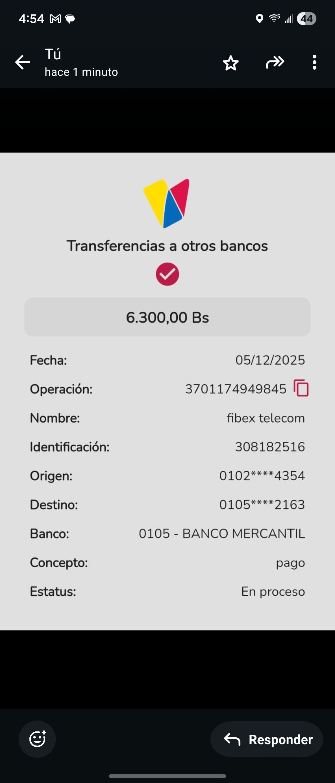 | A42635 | ANGELICA ELIZABETH MISLE MISLE | 2025-12-05 | MERCANTIL-4381-ARAGU | 95501563 | | 9,891.90 BS | 247.30 | REGISTRADO |
