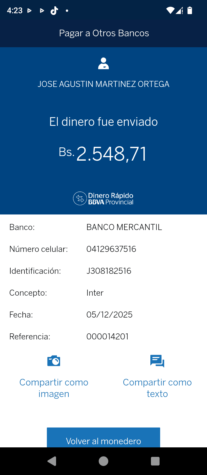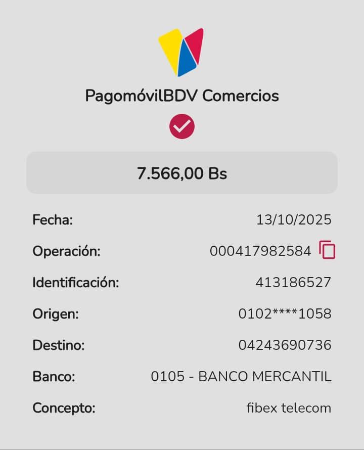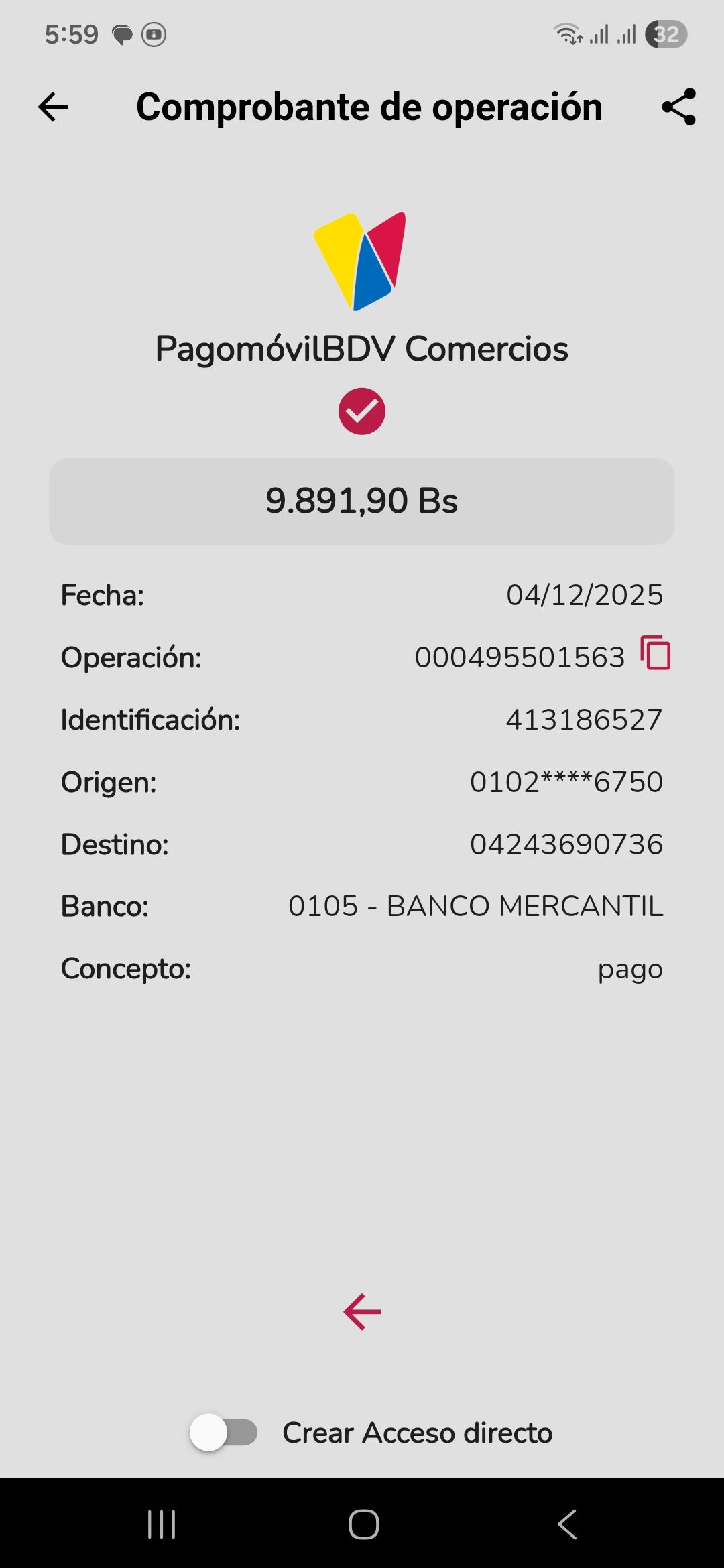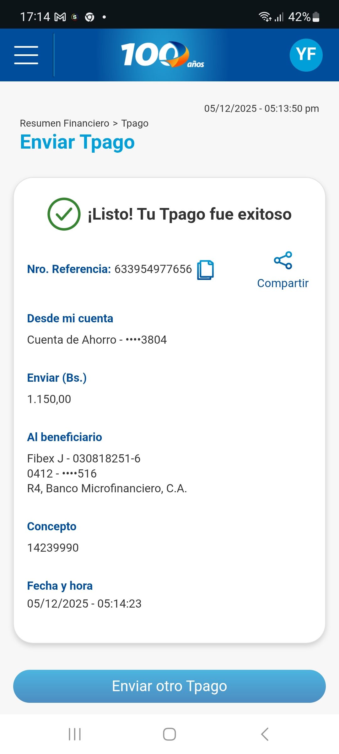 | A42635 | ANGELICA ELIZABETH MISLE MISLE | 2025-12-05 | MERCANTIL-4381-ARAGU | 95501563 | | 9,891.90 BS | 247.30 | REGISTRADO |