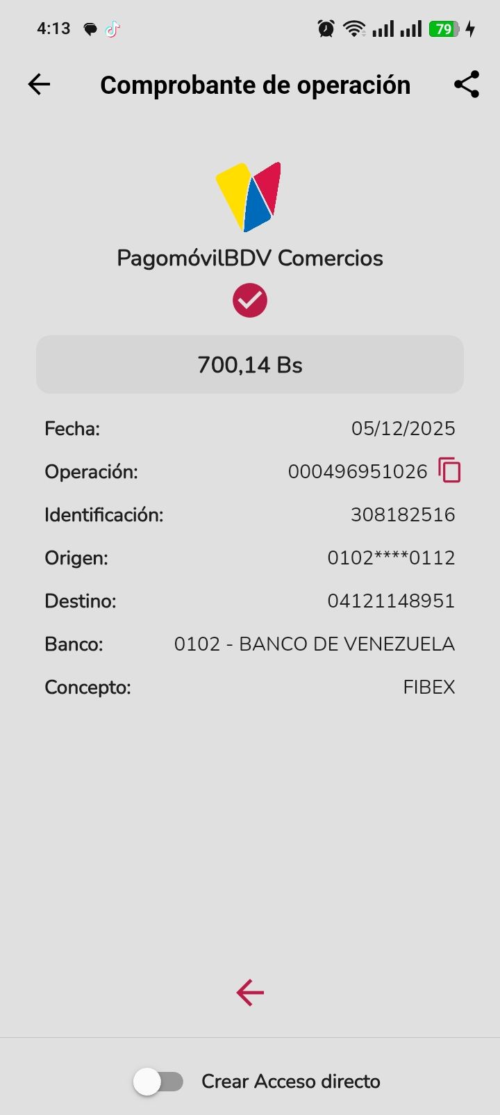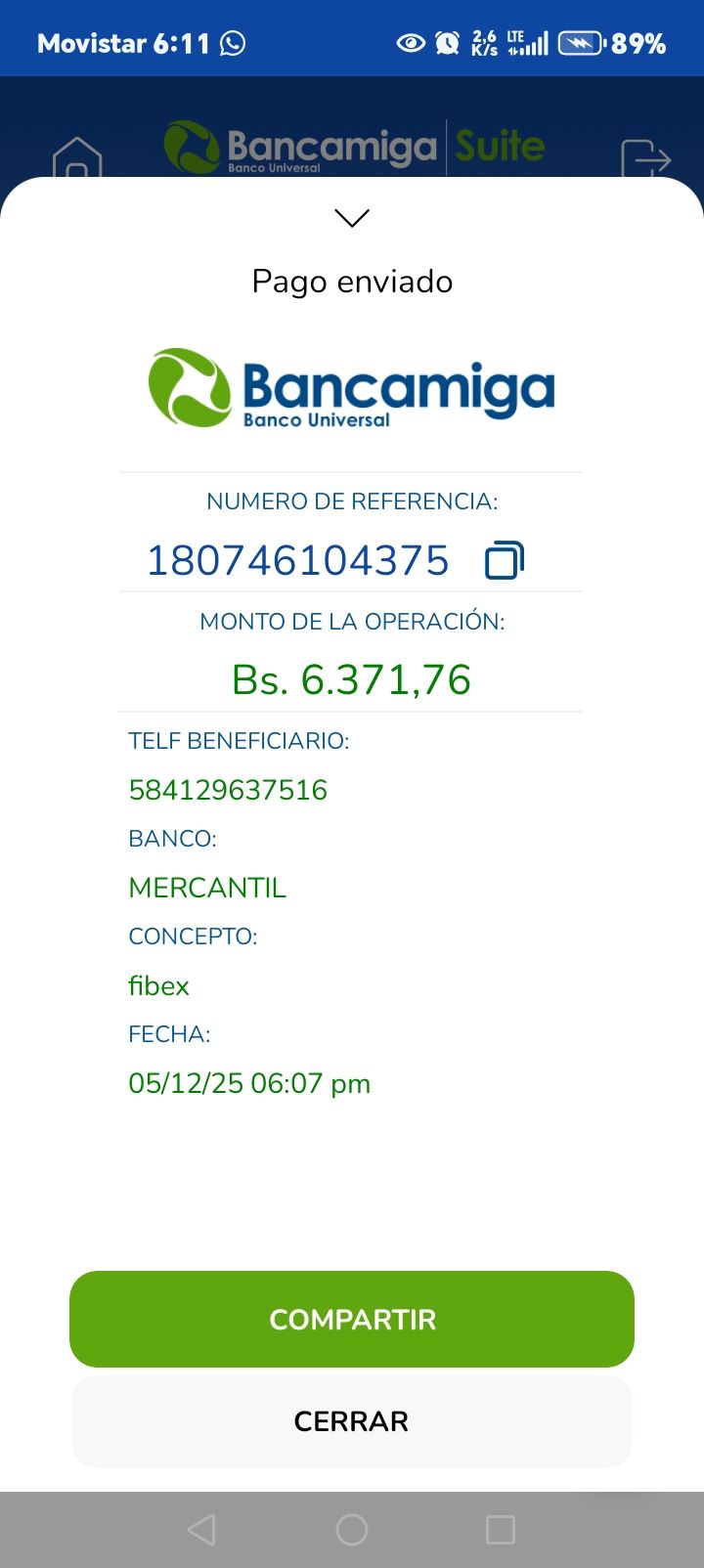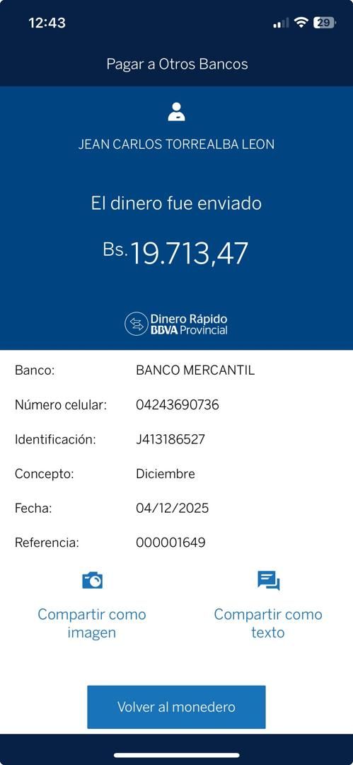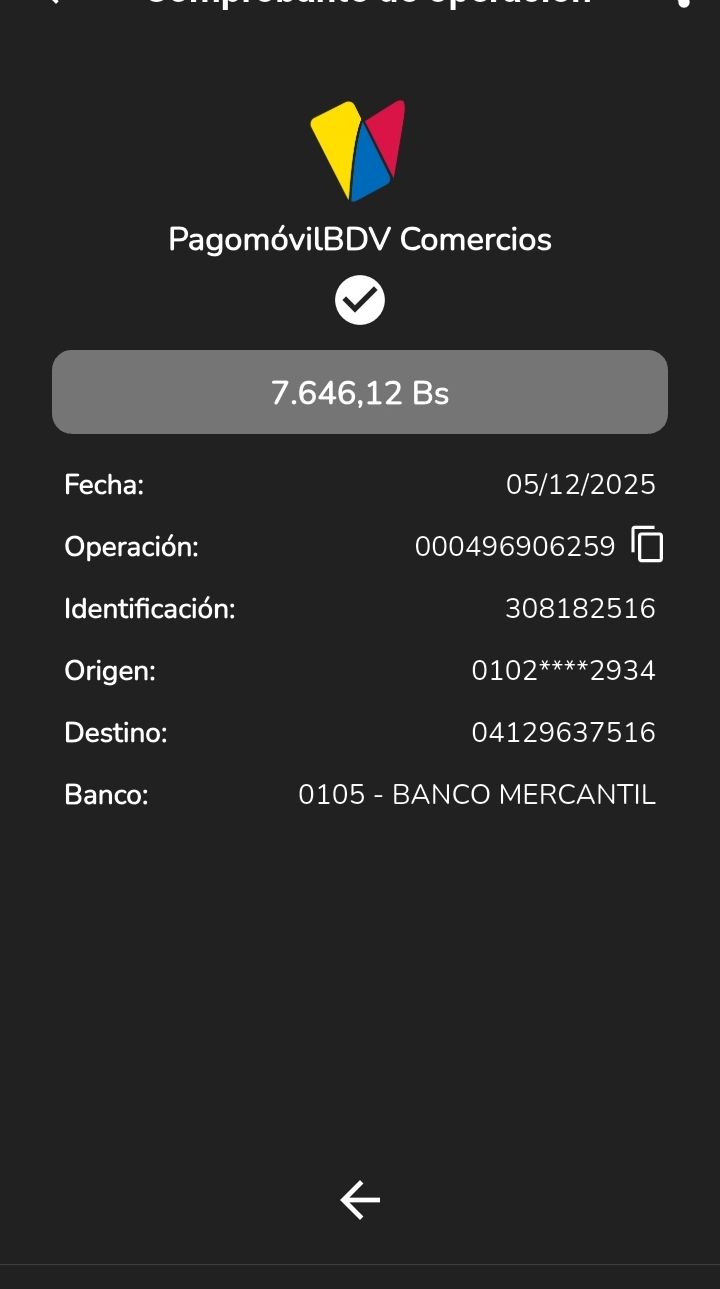 | V62639 | LEONARDO ANTONIO SALAS TIRADO | 2025-12-05 | MERCANTIL 2163 | 618412924 | | 4,719.00 BS | 247.30 | REGISTRADO |
