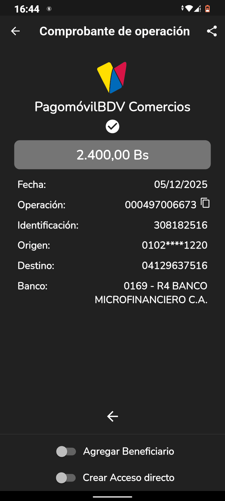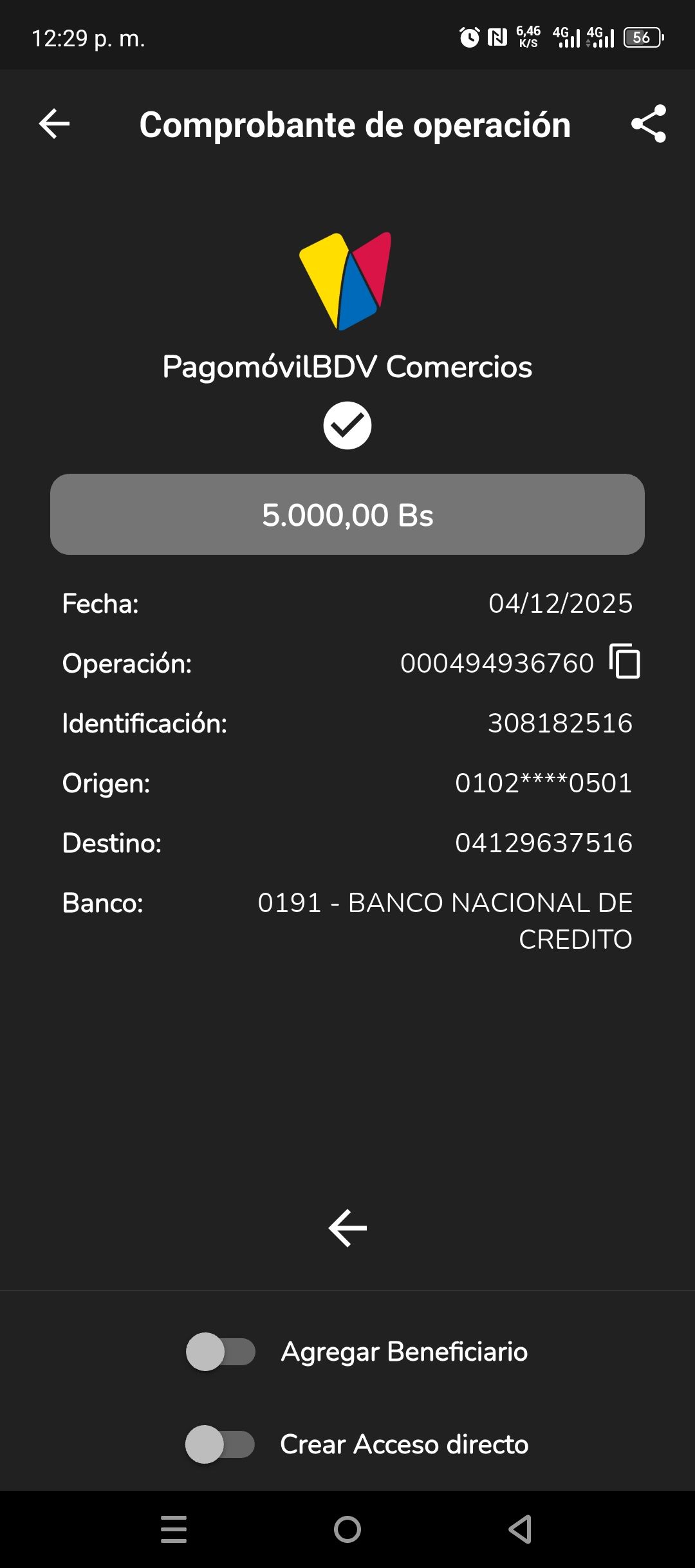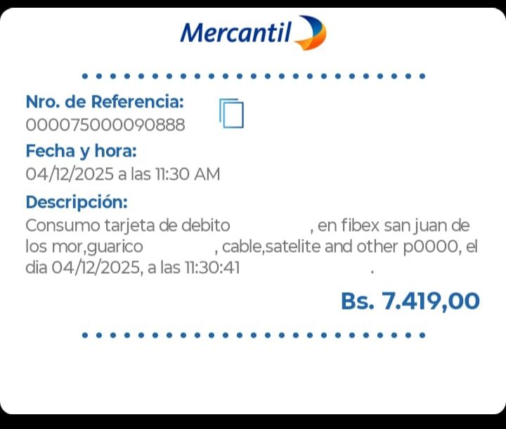 | A35768 | MARIO RAMON LOPEZ AULAR | 2025-12-05 | MERCANTIL-4381-ARAGU | 270940 | | 8,800.00 BS | 247.30 | REGISTRADO |