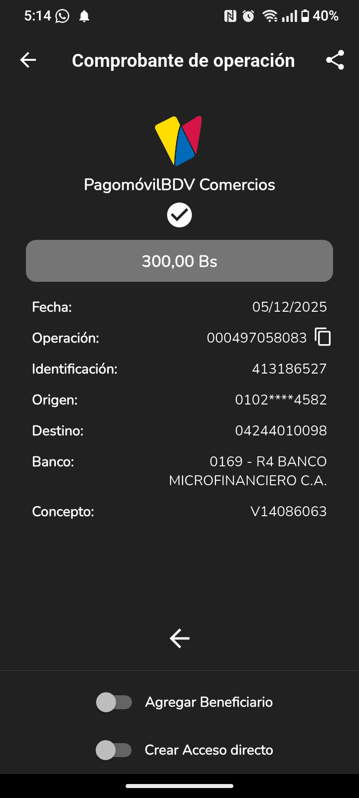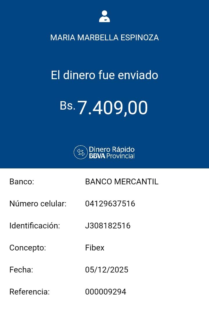 | V45443 | MARIA MARBELLA ESPINOZA | 2025-12-05 | MERCANTIL 2163 | 08182516 | | 7,409.00 BS | 247.30 | REGISTRADO |