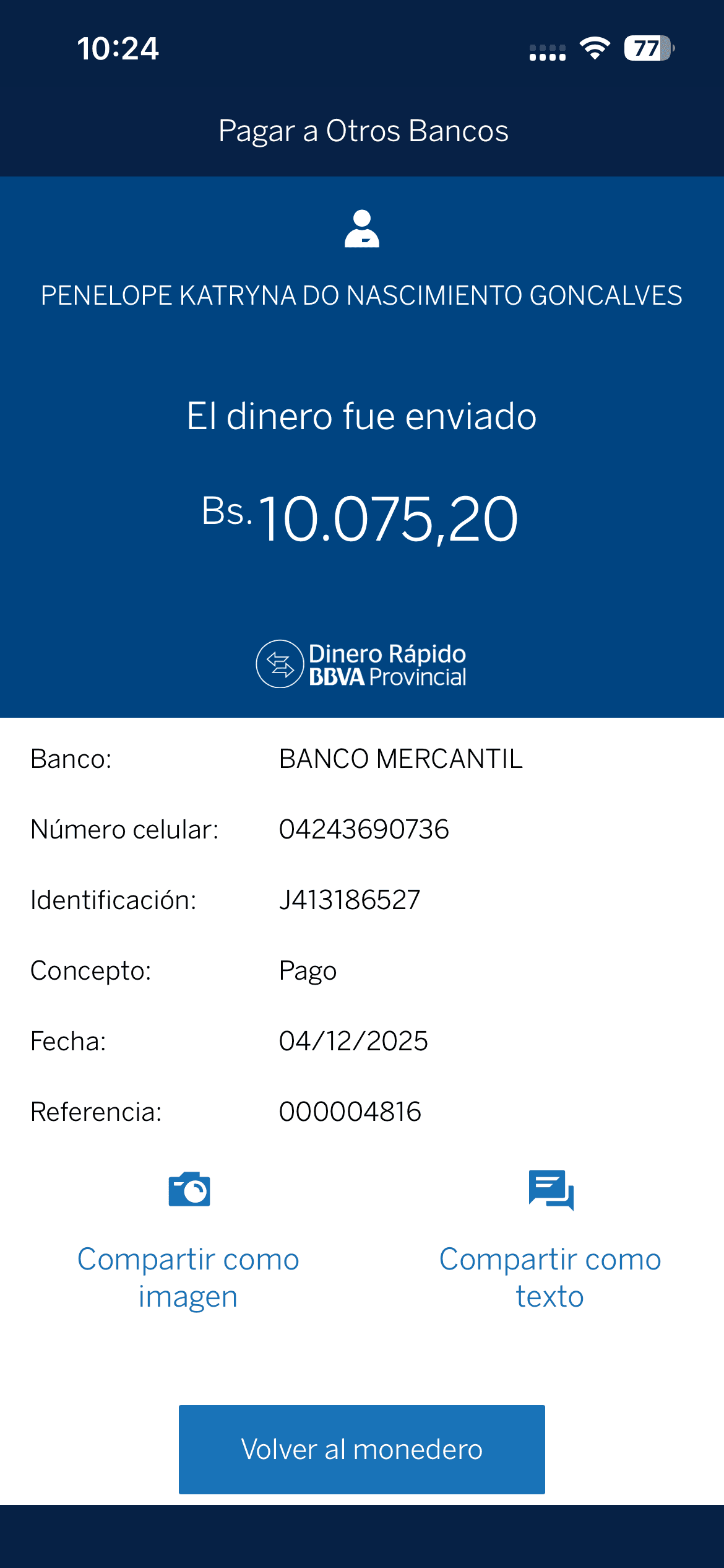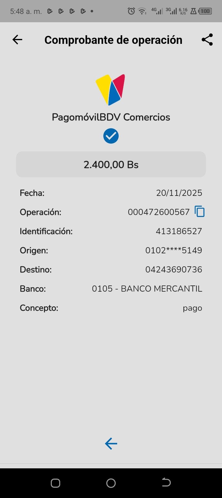 | BQ3087 | ALISMARY CAROLINA RAMIREZ TORRES | 2025-11-17 | MERCANTIL 2163 | 71896927 | | 5,584.44 BS | 223.96 | REGISTRADO |