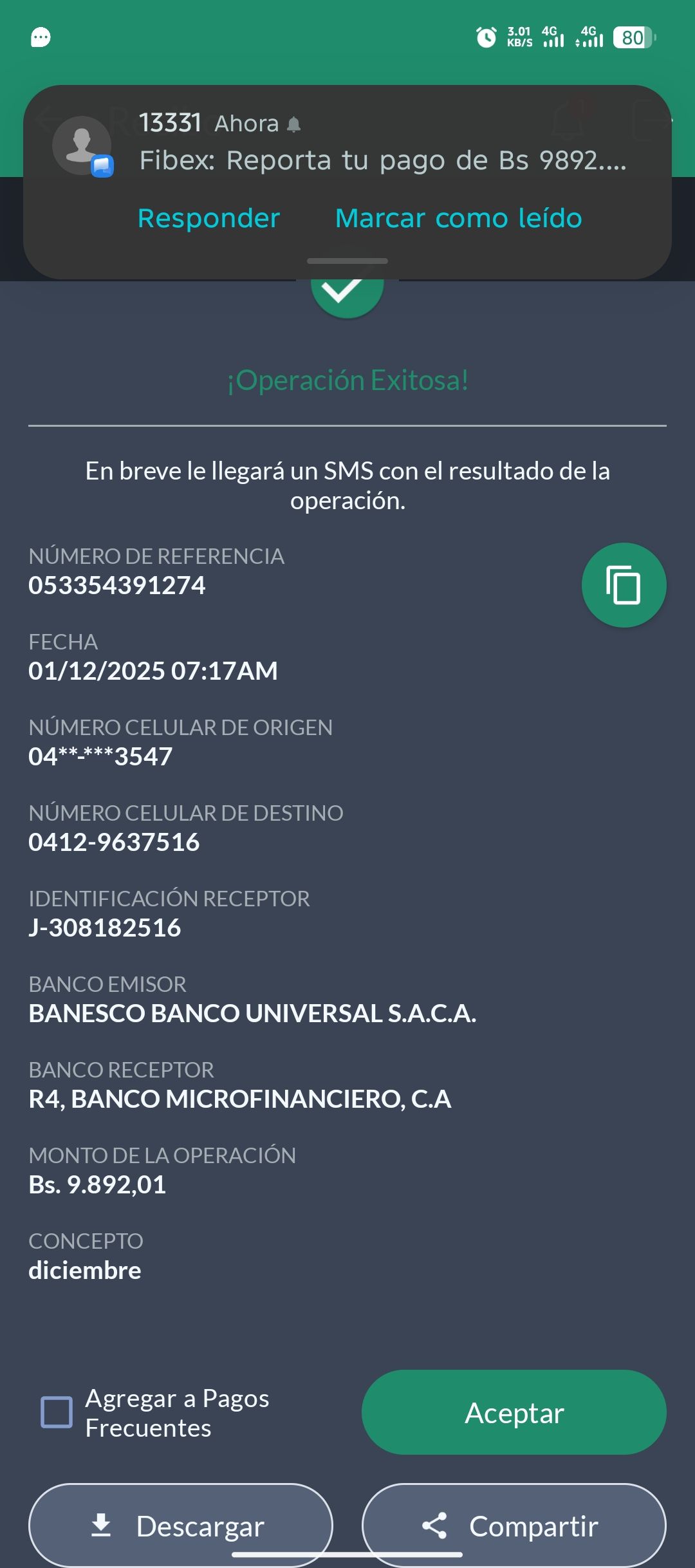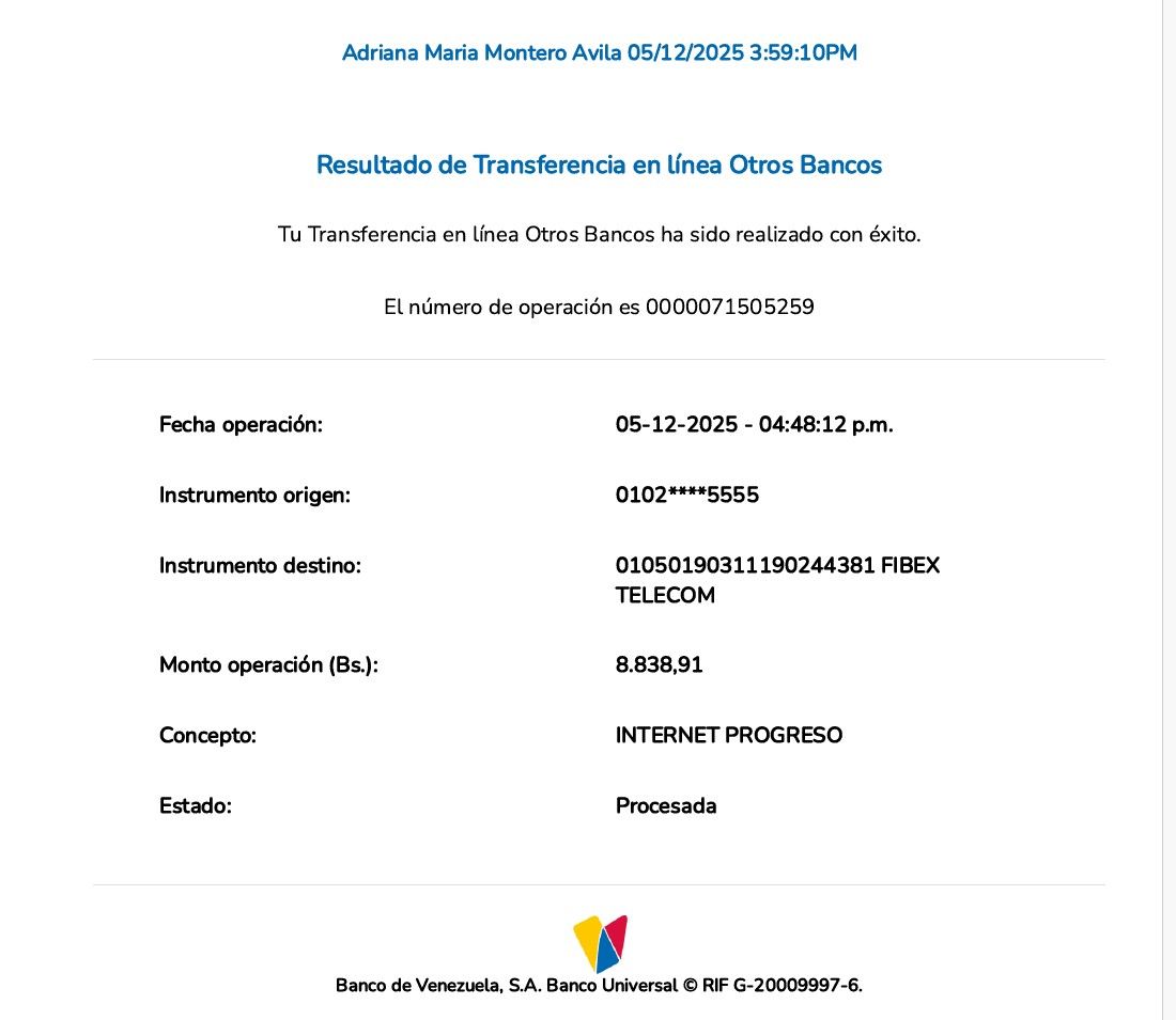 | A54736 | JAVIER ANTONIO SULBARNA CACERES | 2025-12-05 | MERCANTIL-4381-ARAGU | 86940619 | | 8,655.50 BS | 247.30 | REGISTRADO |