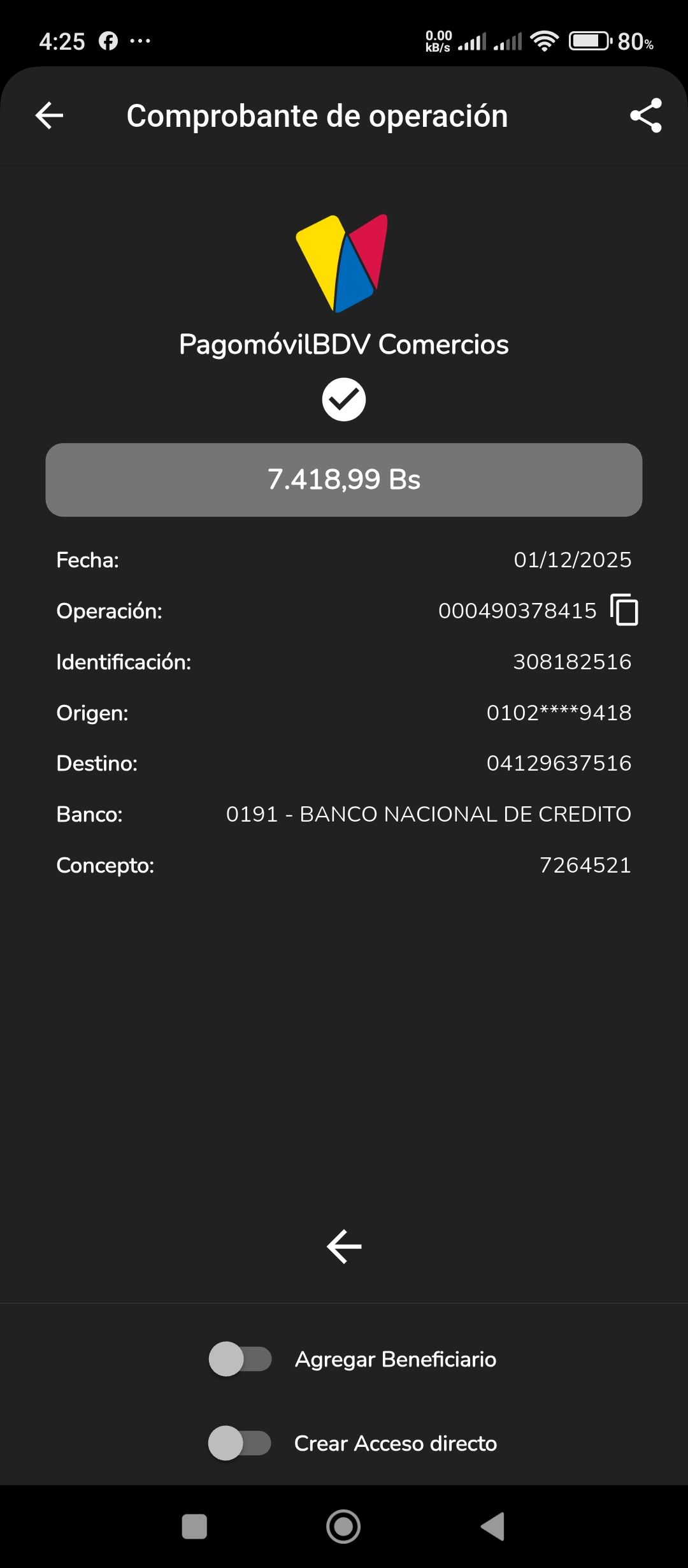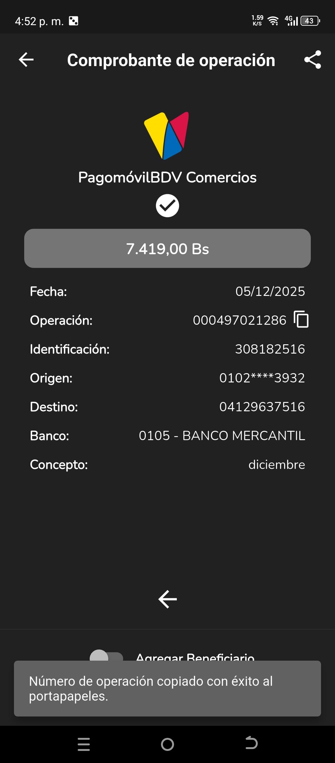 | A51309 | ANDY JESUS ZARATE PERALTA | 2025-12-05 | MERCANTIL-4381-ARAGU | 97021286 | | 7,419.00 BS | 247.30 | REGISTRADO |