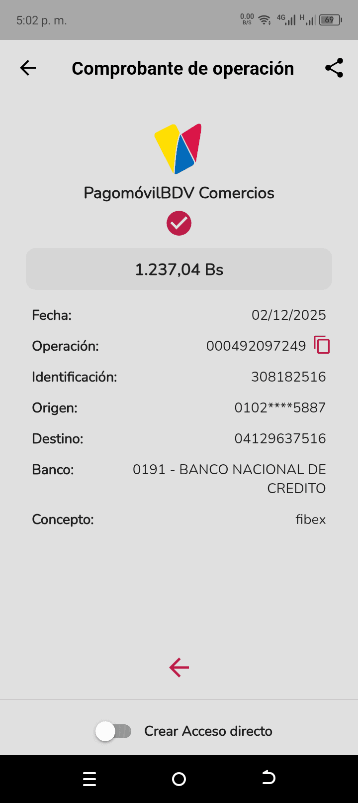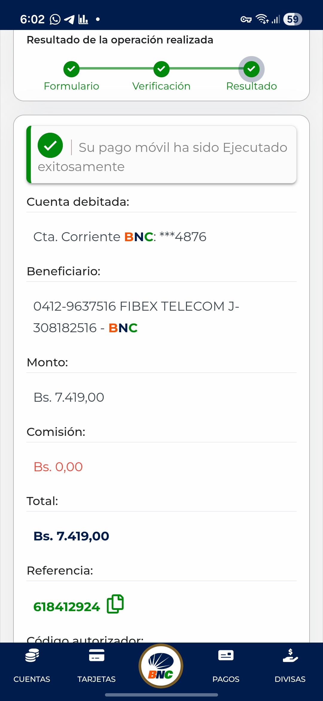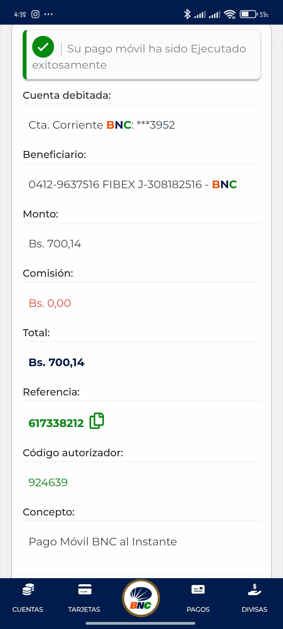 | A56262 | ANTHONI JUNIOR COLINA CHACON | 2025-12-05 | BNC 6064 | 92097249 | | 1,237.04 BS | 247.30 | REGISTRADO |