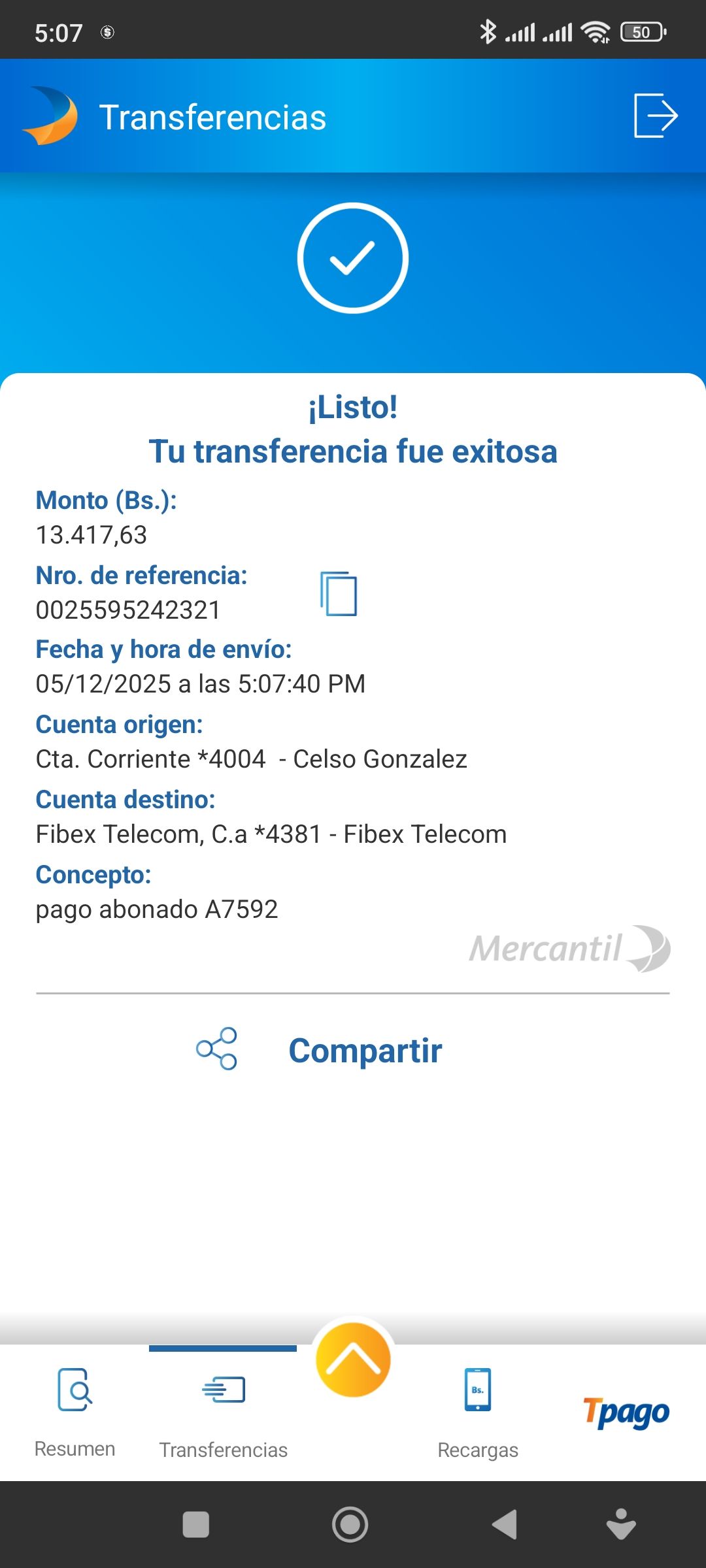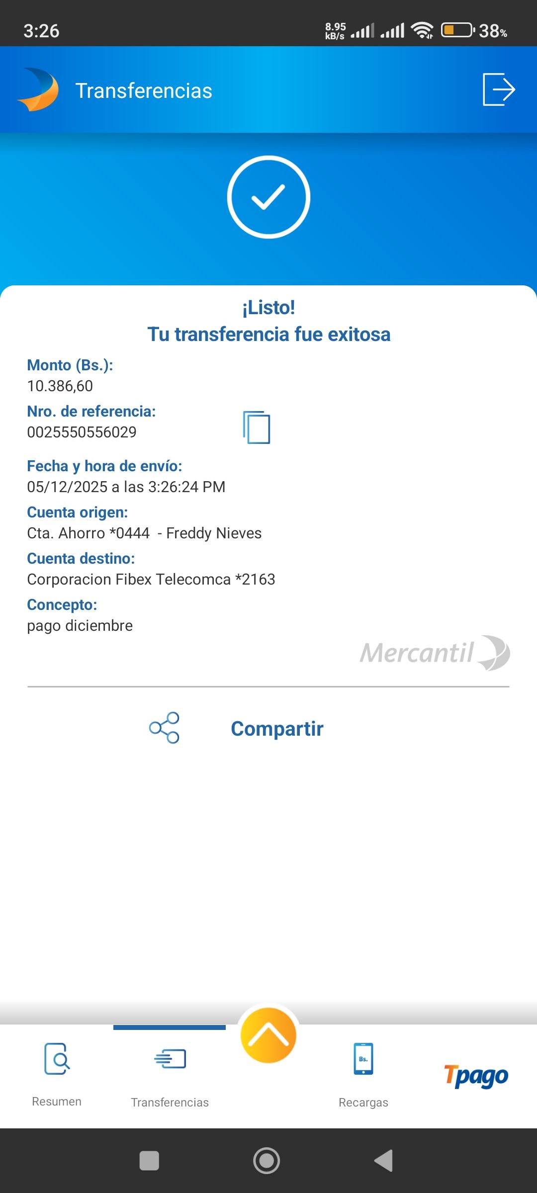 | A60755 | LUIS MIGUEL COLMENARES CASTRO | 2025-12-05 | MERCANTIL-4381-ARAGU | 7150525 | | 8,838.91 BS | 247.30 | REGISTRADO |