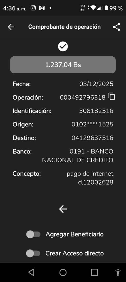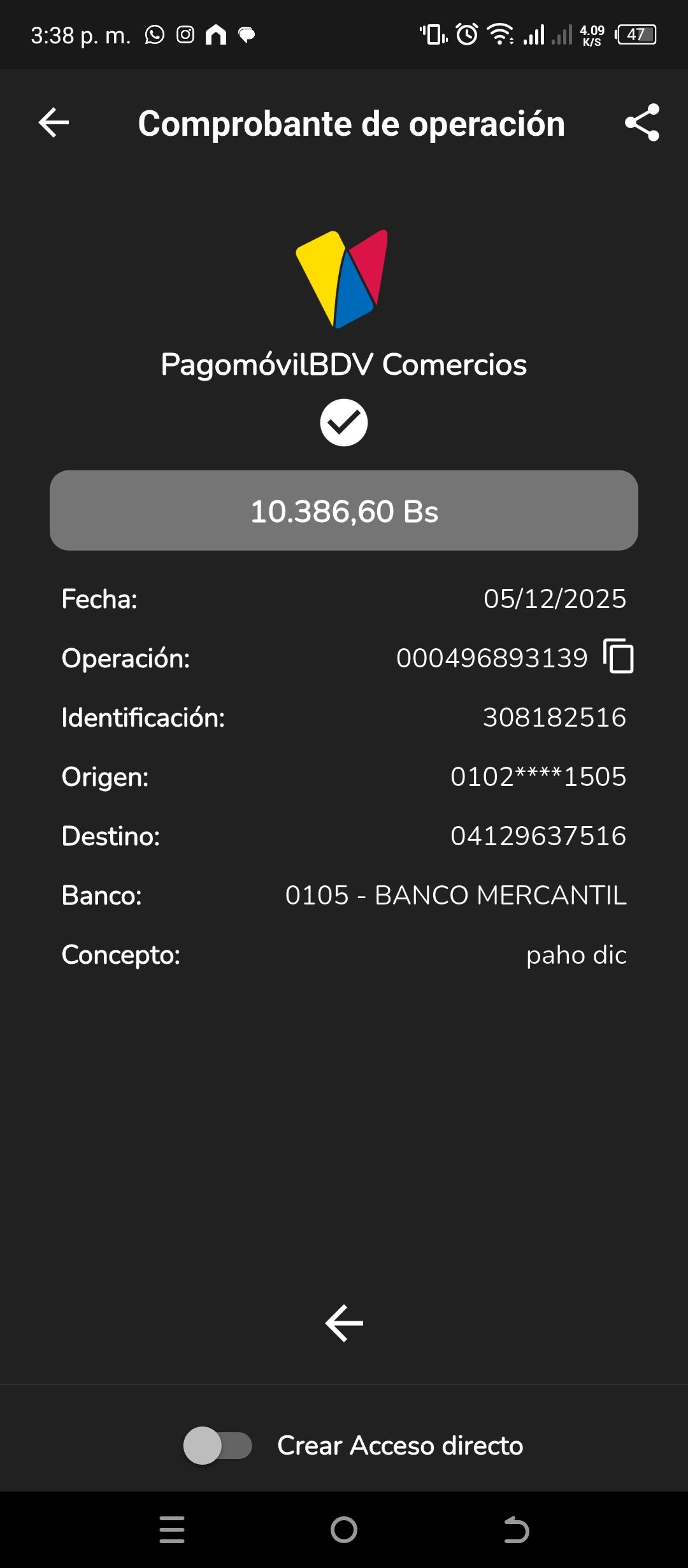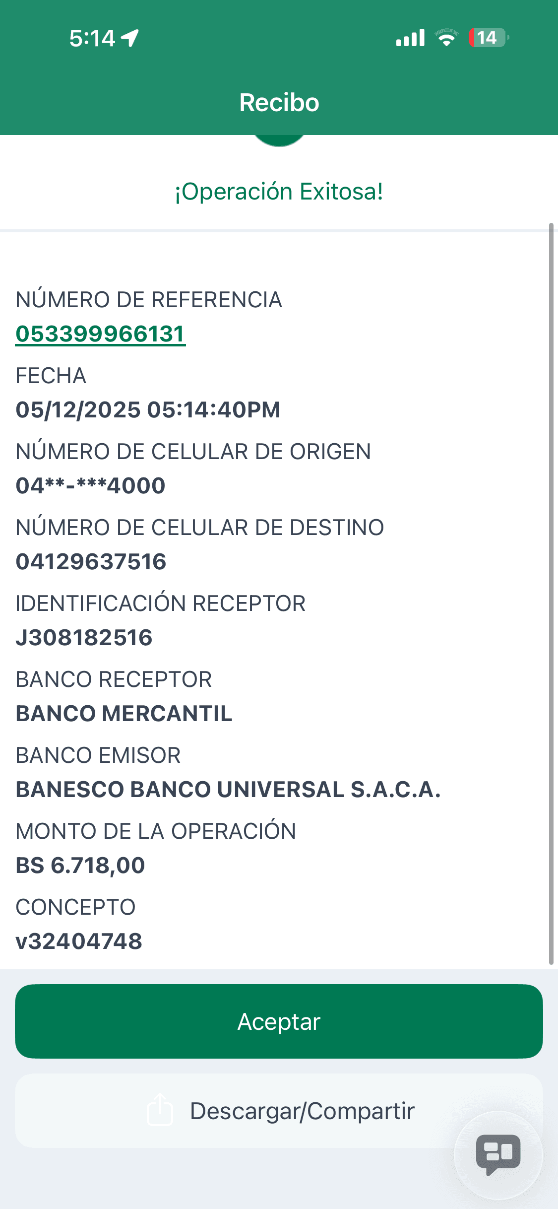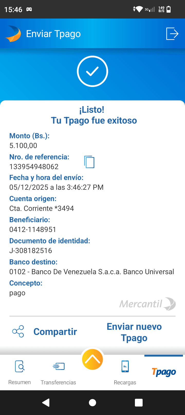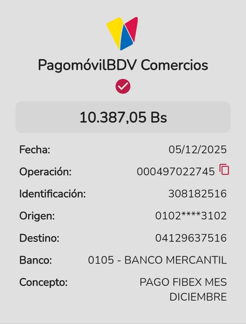 | LCH67437 | JOSE RAMON TAYUPO GRANADINO | 2025-12-05 | MERCANTIL 2163 | 90048091 | | 4,944.97 BS | 247.30 | REGISTRADO |