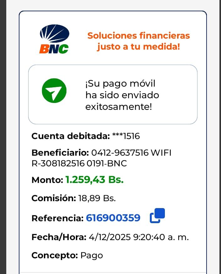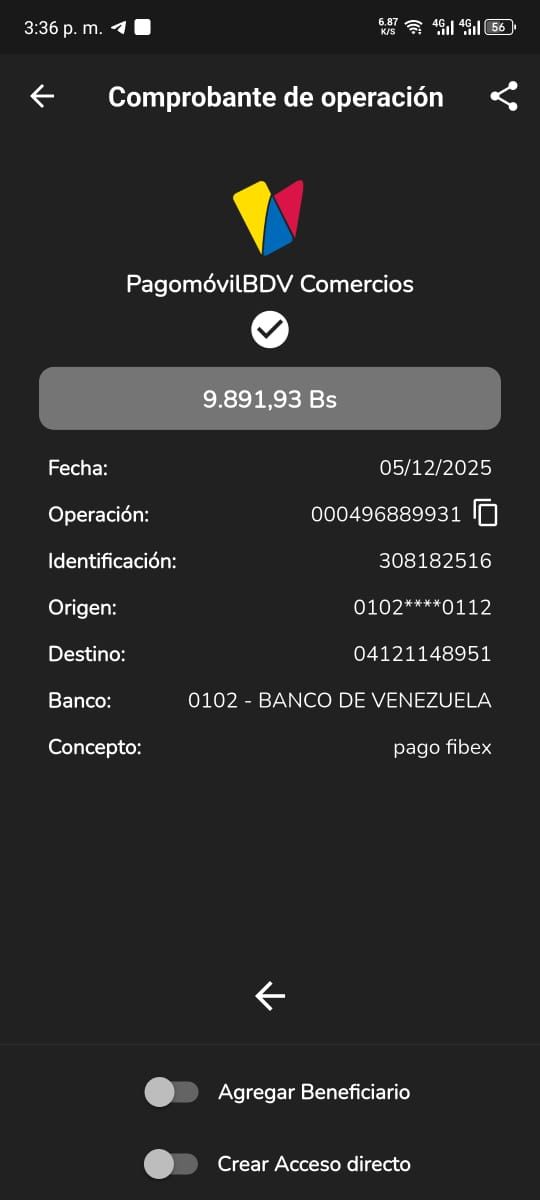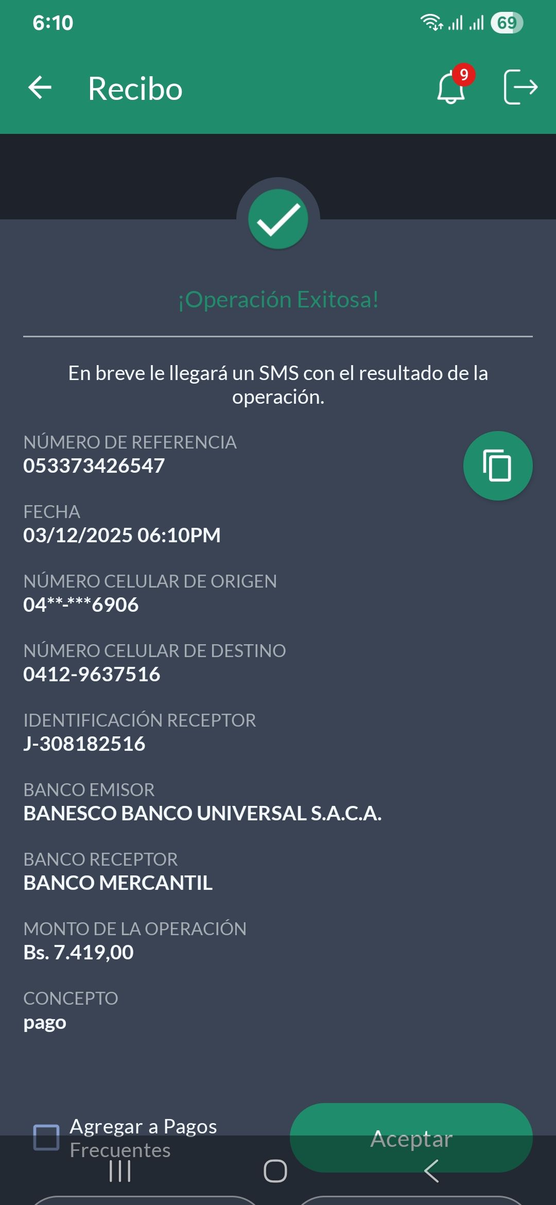 | A54736 | JAVIER ANTONIO SULBARNA CACERES | 2025-12-05 | MERCANTIL-4381-ARAGU | 86940619 | | 8,655.50 BS | 247.30 | REGISTRADO |