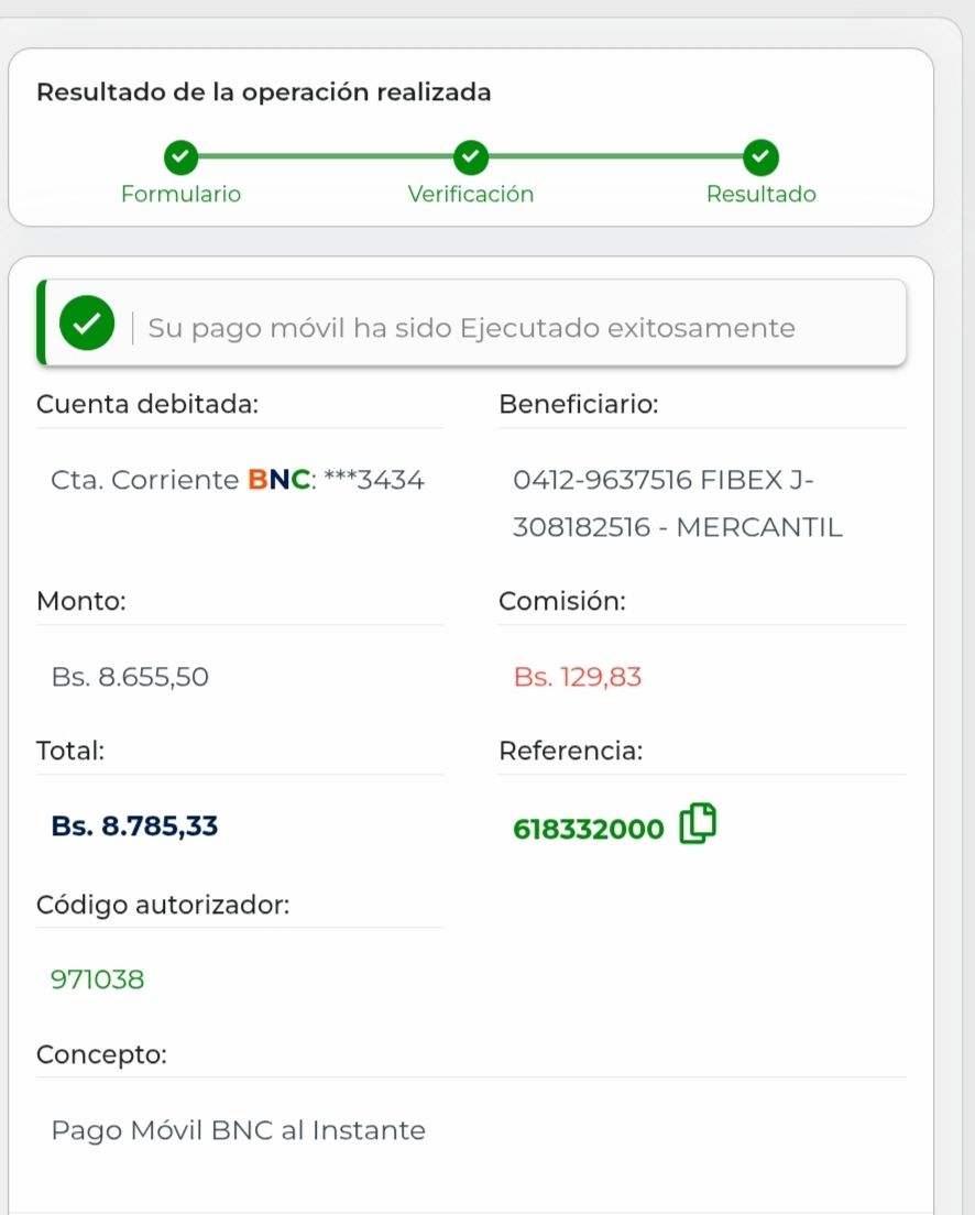 | BQ3087 | ALISMARY CAROLINA RAMIREZ TORRES | 2025-11-17 | MERCANTIL 2163 | 71896927 | | 5,584.44 BS | 223.96 | REGISTRADO |