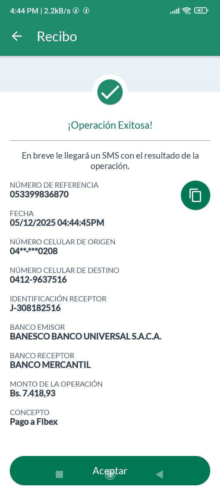 | A42635 | ANGELICA ELIZABETH MISLE MISLE | 2025-12-05 | MERCANTIL-4381-ARAGU | 95501563 | | 9,891.90 BS | 247.30 | REGISTRADO |