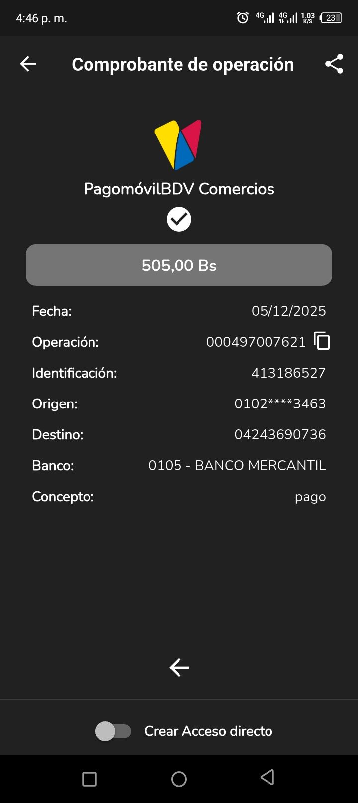 | V23079 | GRACIELA DE LA CONCEPCION RODRIGUEZ PEREIRA | 2025-12-05 | MERCANTIL 2163 | 496955704 | | 1,682.50 BS | 247.30 | REGISTRADO |