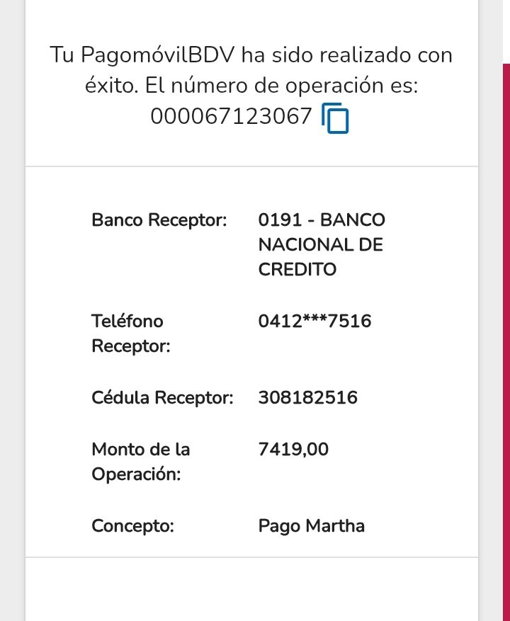 | A64078 | KEIDERLY NAZARETH AVILA CALDERON | 2025-12-05 | MERCANTIL 2163 | 899841 | | 7,419.00 BS | 247.30 | REGISTRADO |