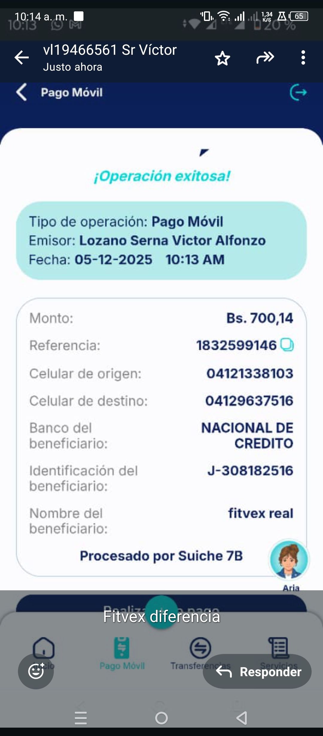 | A55266 | VíCTOR ALFONZO LOZANO SERNA | 2025-12-05 | MERCANTIL-4381-ARAGU | 1832599146 | | 700.14 BS | 247.30 | REGISTRADO |