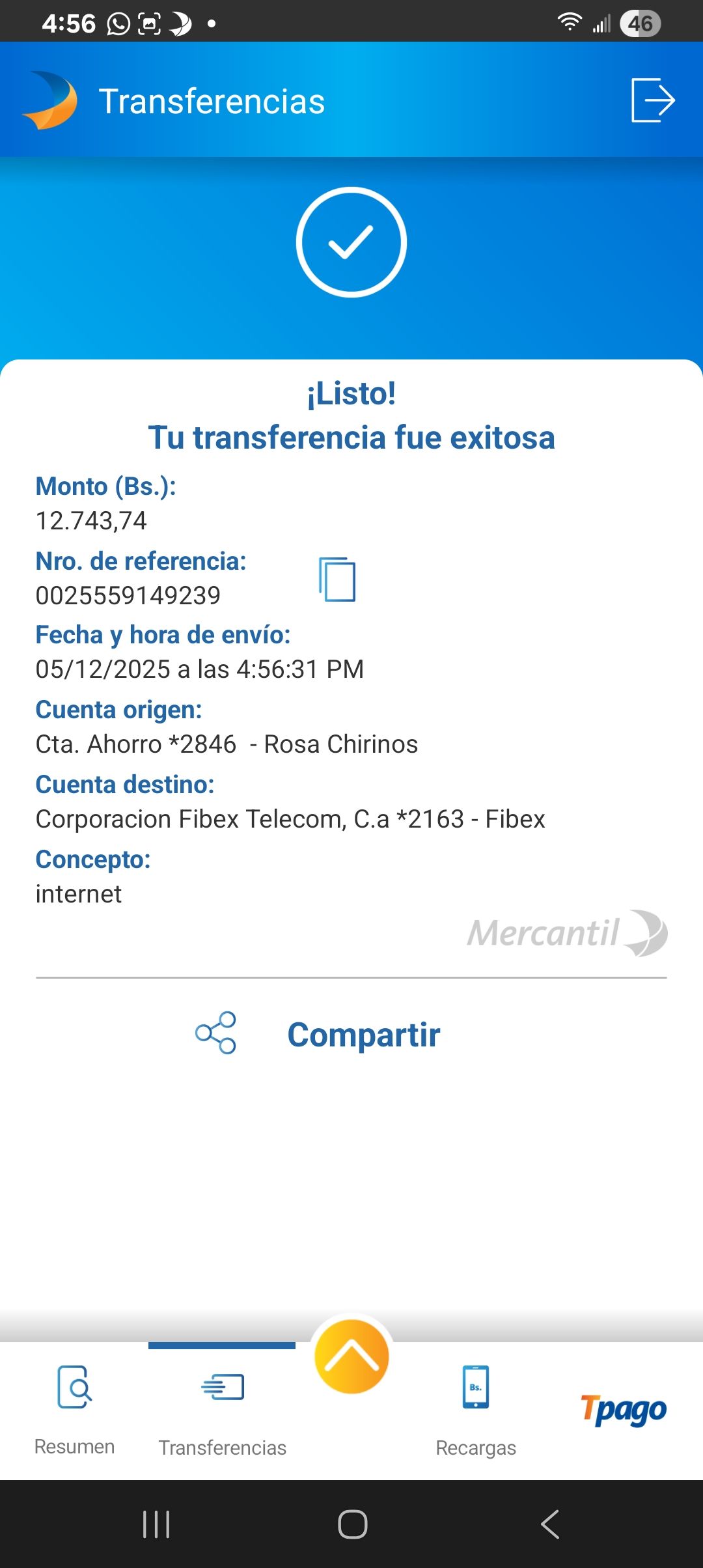 | BQ5014 | ROSA CHIRINO | 2025-12-05 | MERCANTIL 2163 | 55914923 | | 12,743.74 BS | 247.30 | REGISTRADO |