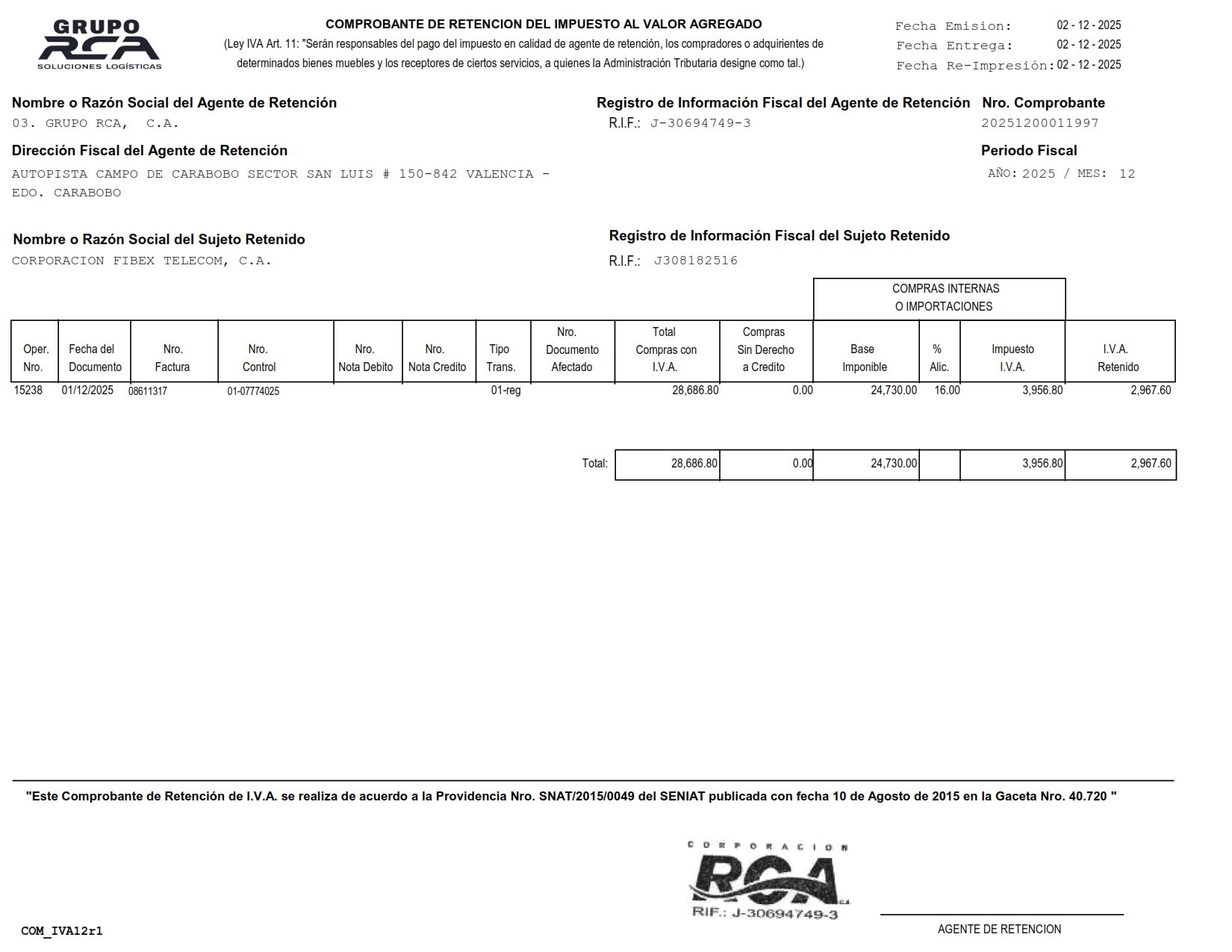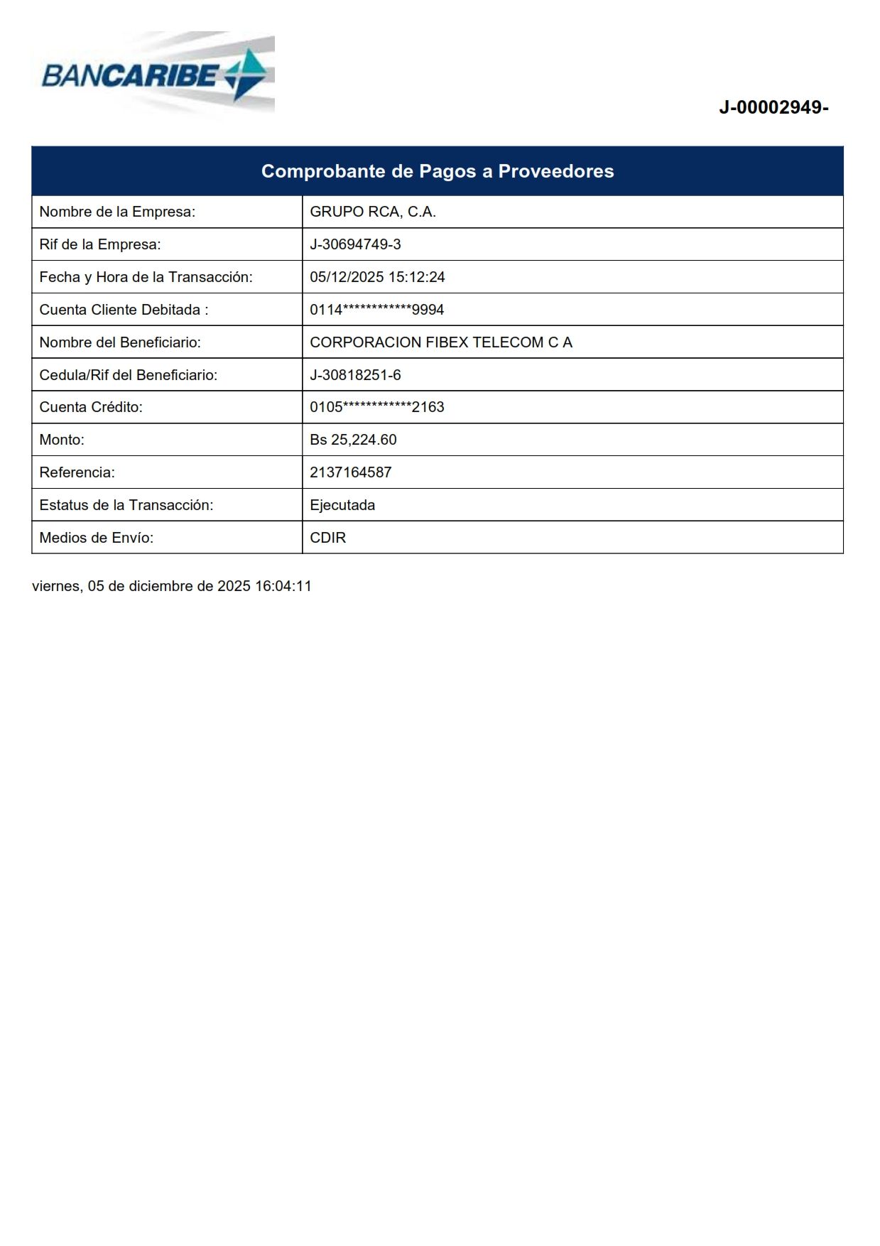 | V53313 | GRUPO RCA CA | 2025-12-05 | MERCANTIL 2163 | 2137164567 | | 25,224.60 BS | 247.30 | REGISTRADO |
